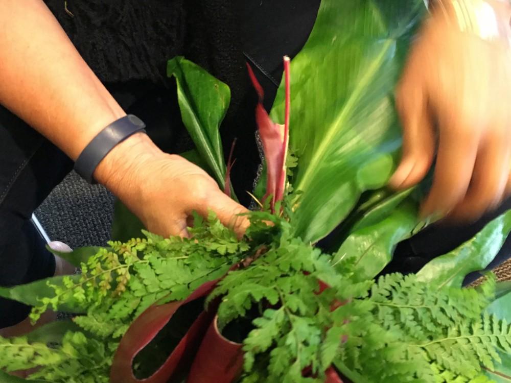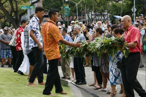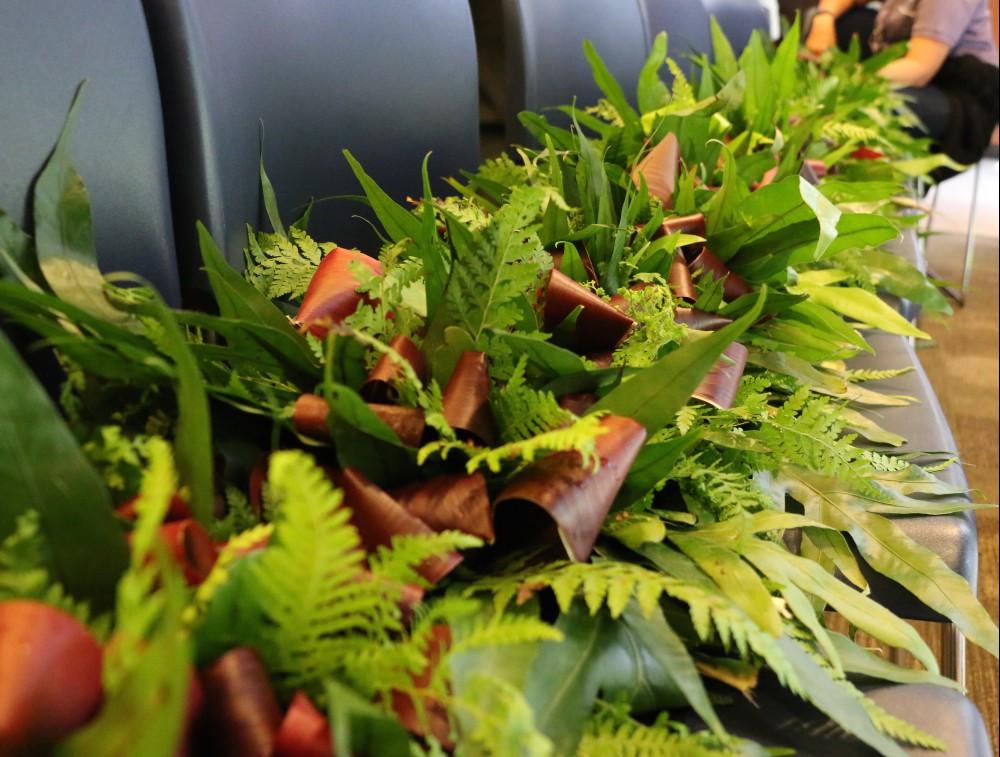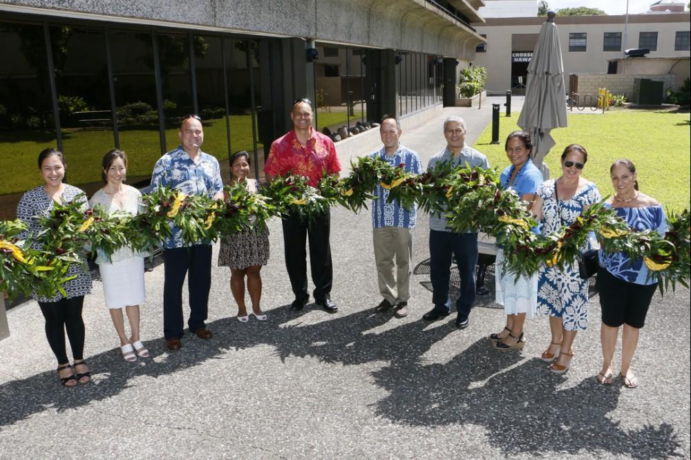 Representatives from across the KS organization took part in the annual Lei Draping Ceremony on Friday, June 11 at Aliʻiōlani Hale, presenting a 30-foot garland created by the hands of many Kawaiaha‘o Plaza staffers. The Administration Group coordinated the making of the lei which was braided together with laua‘e leaves, green and red lāʻī leaves, palapalai fern, along with strands sewn from the hala fruit. Lei materials were gathered by staff members from KS properties on O‘ahu.