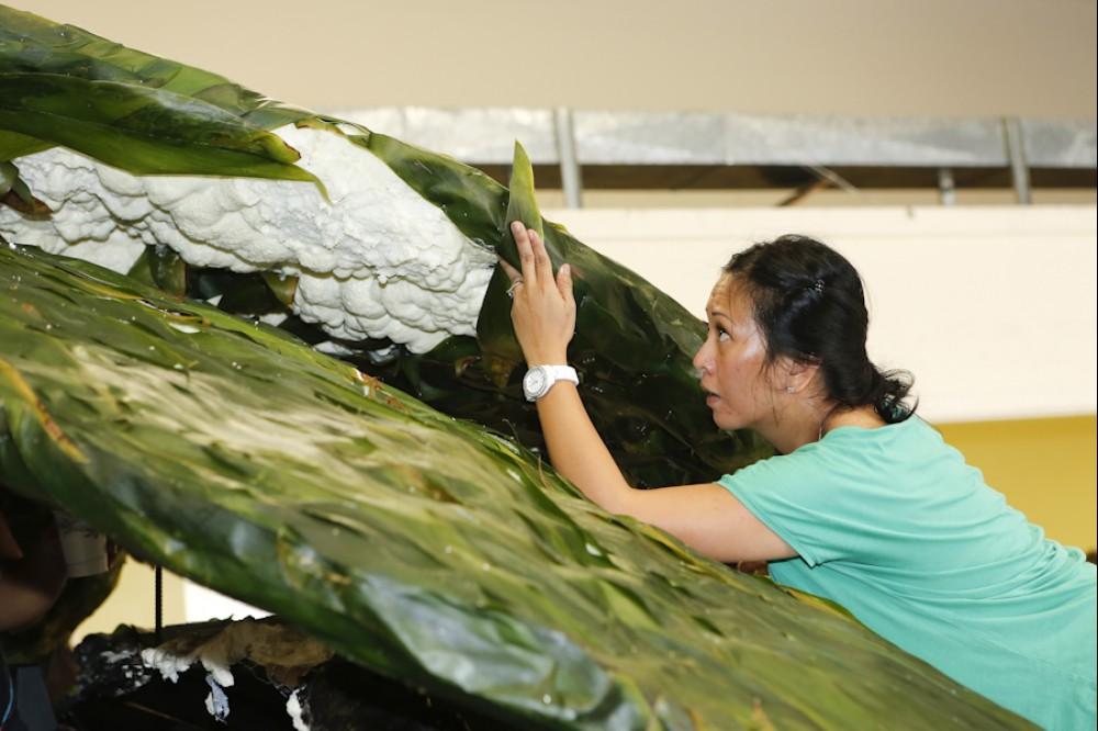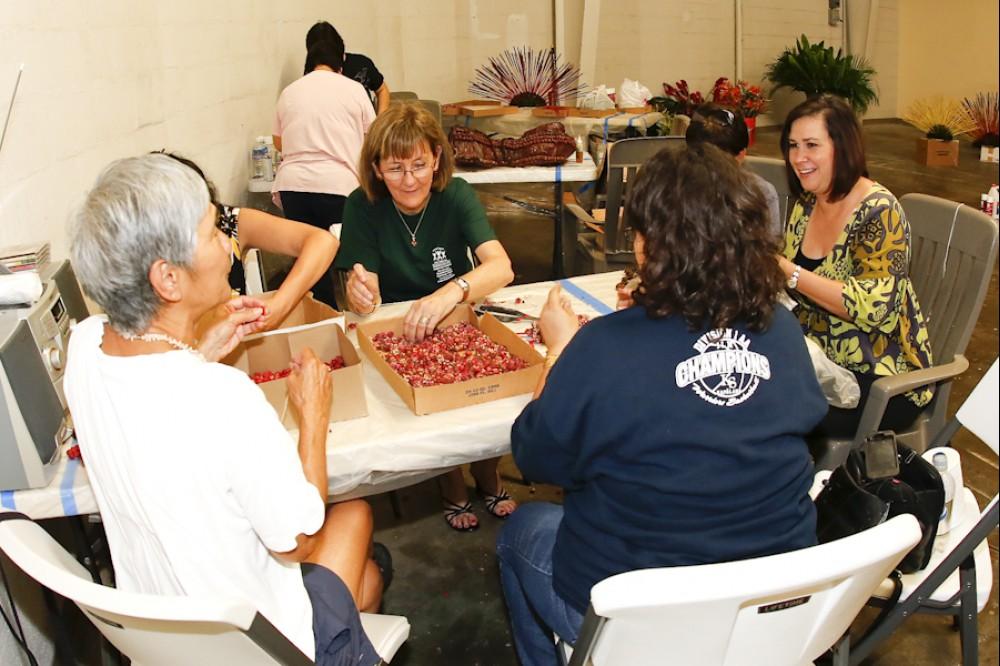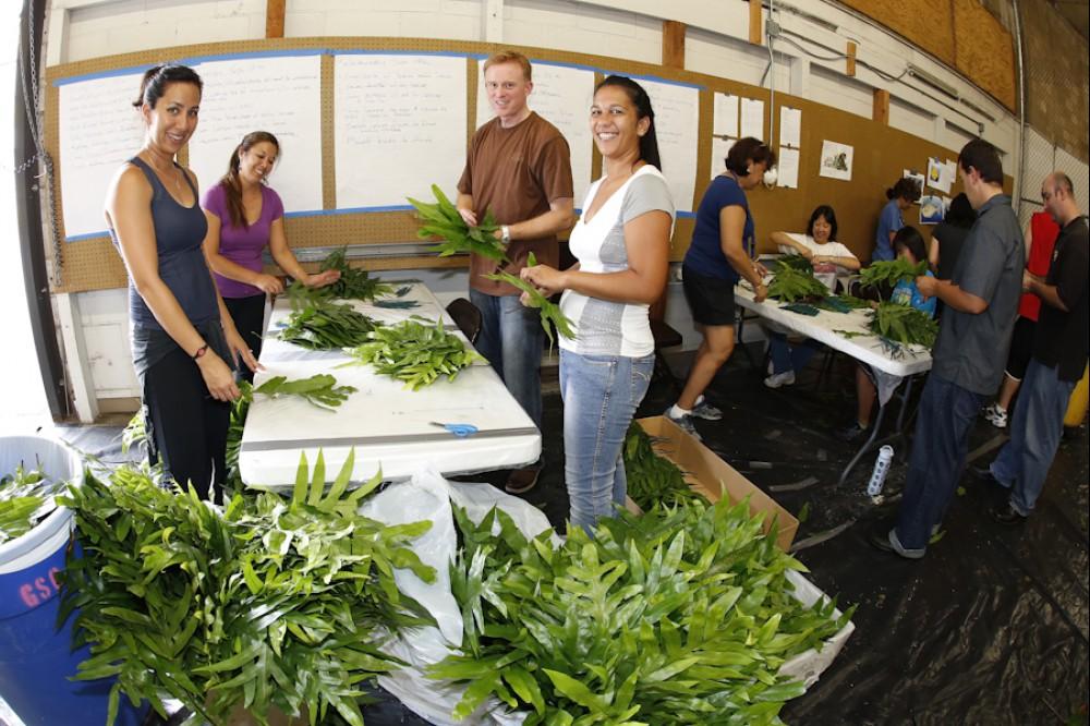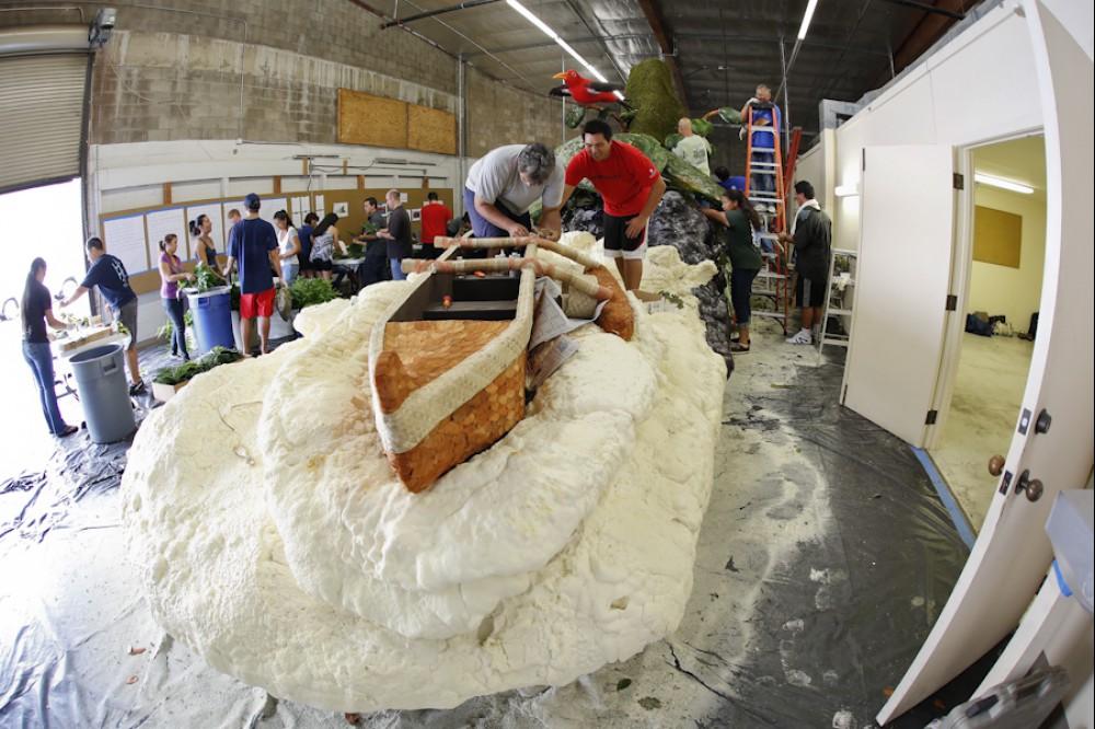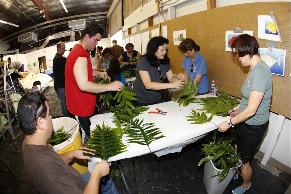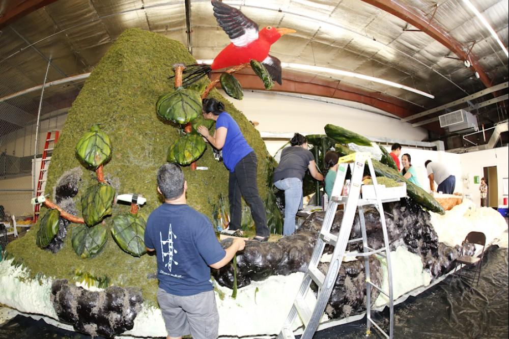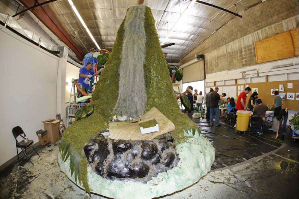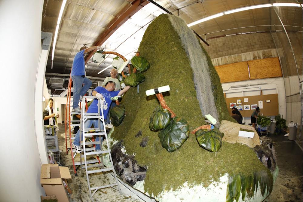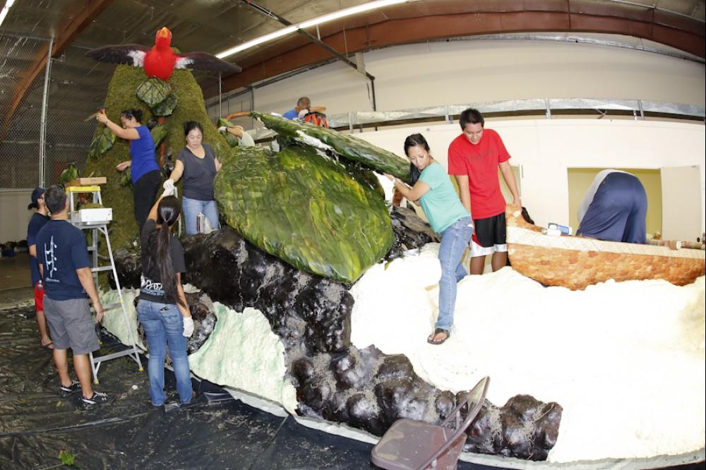 So will the float be finished on schedule, ahead of schedule or just before the parade starts???!!!! Here are pictures from Thursday afternoon at the Kaka'ako warehouse where KS volunteers were steadily building the minature rolling island that will feature cascading waterfalls, fields of kalo and graceful hula dancers.