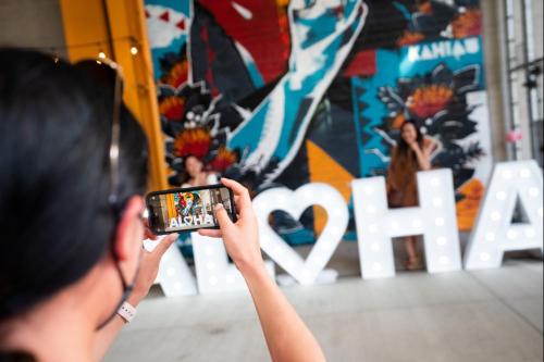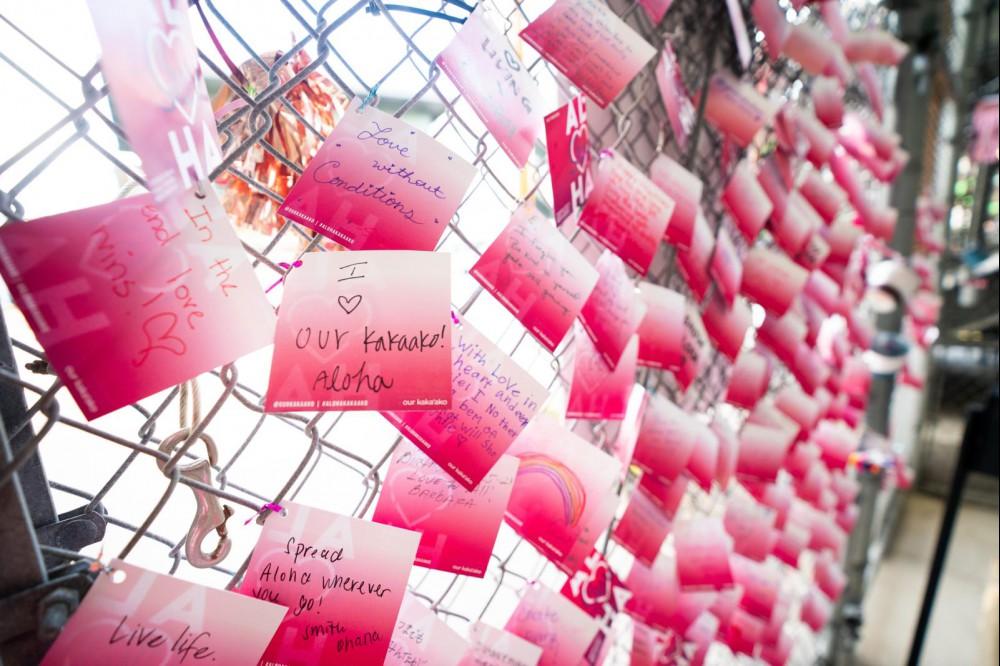 From families to four-legged friends, many shared their own sentiments of aloha to the art display by writing messages on “Share AL♡HA” postcards and hanging them on the fence at The BARN to create a visual “wall of love.”
