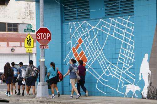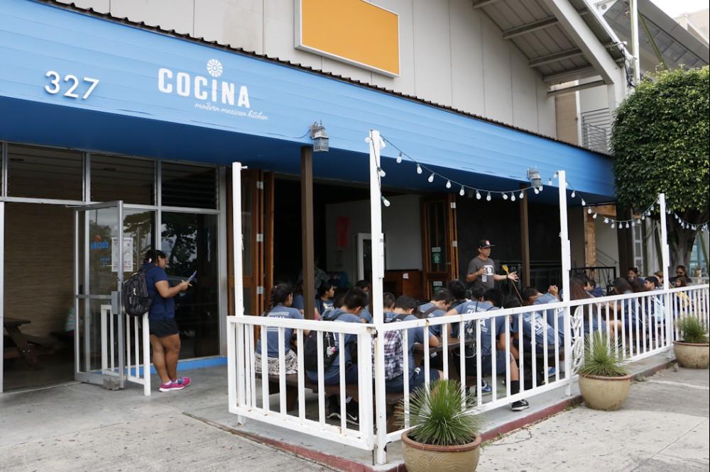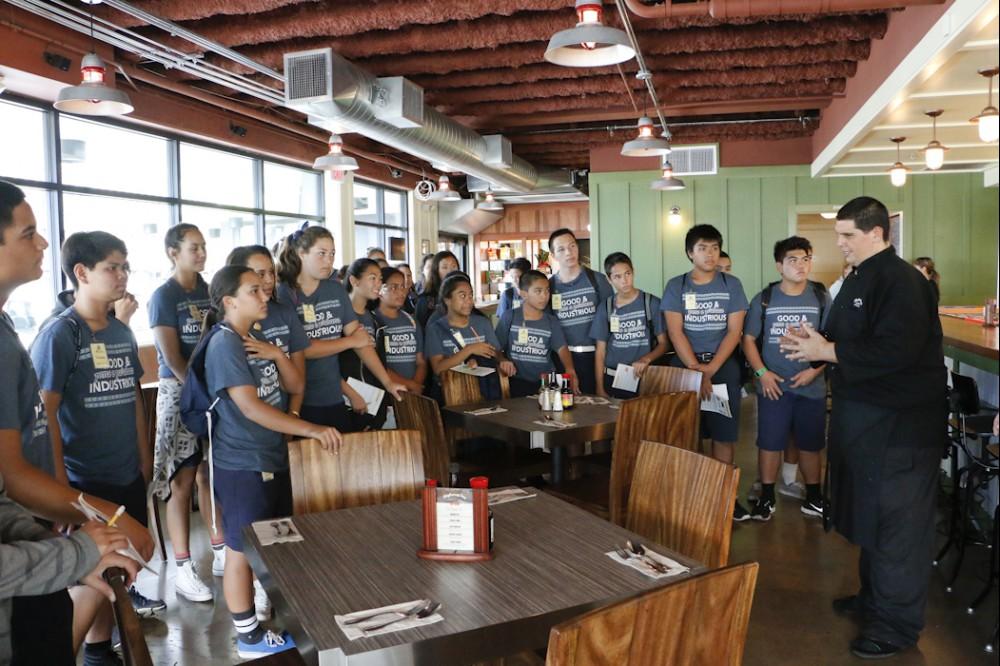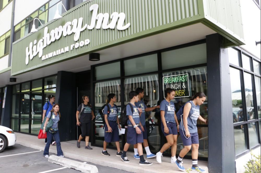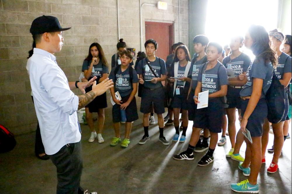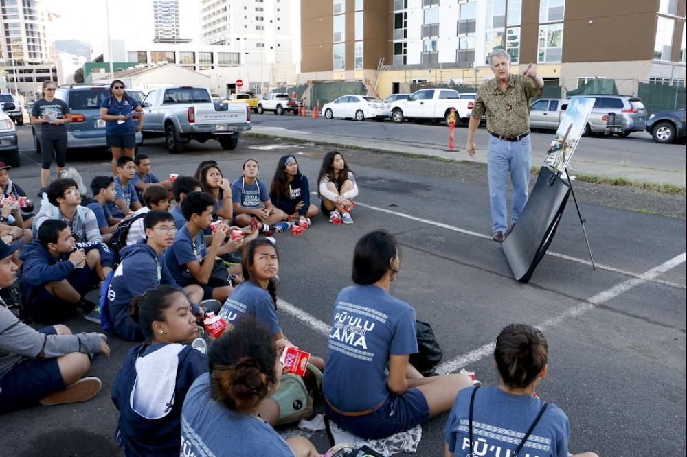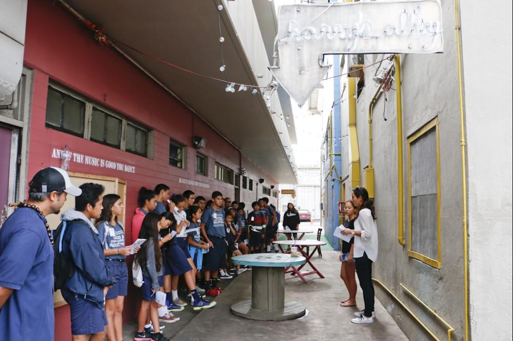 KS Kapālama eighth graders toured Kamehameha properties in Kakaʻako recently to learn about the coming changes to the neighborhood. Guided by KS senior asset manager Christian O'Connor, students were updated on new development plans and heard stories from business people already working in the area.