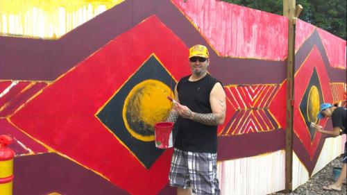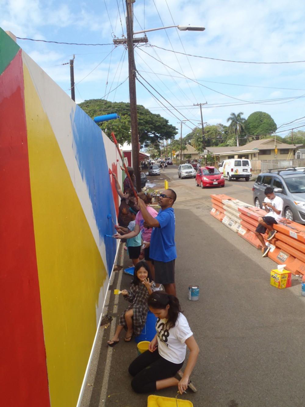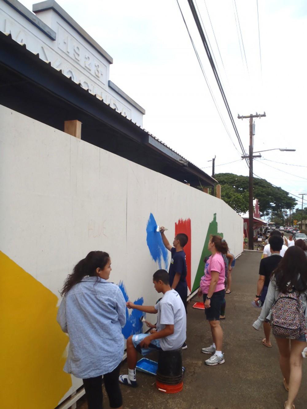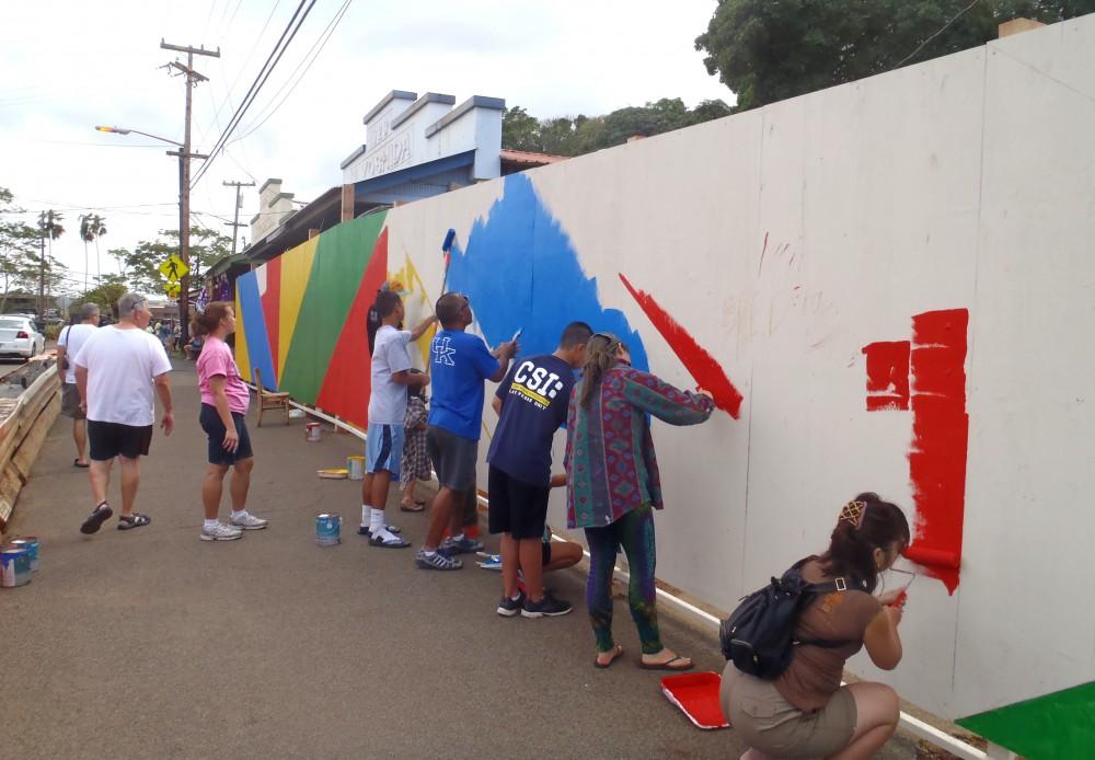 A 400-foot-wide barricade was recently erected along Kamehameha Highway in Haleʻiwa to protect passing pedestrians and vehicles from the construction of the KS commercial project Haleʻiwa Store Lots. To deter unwanted graffiti, KS hired artists to design a mural honoring the history of Haleʻiwa through various iconic images.