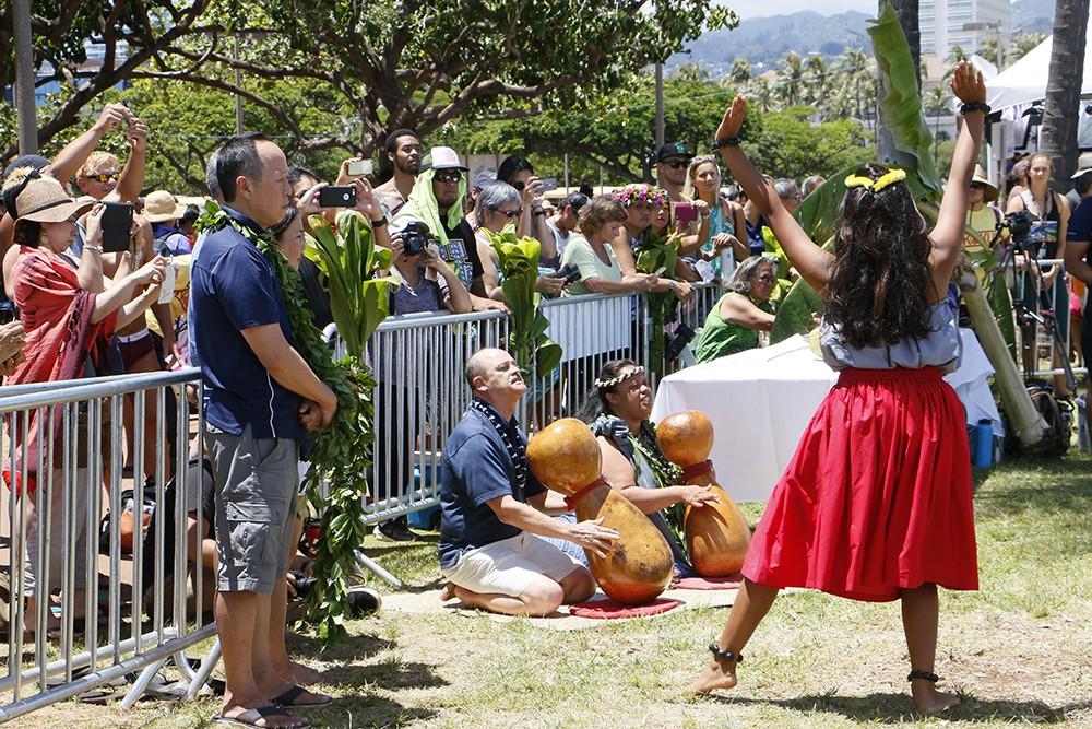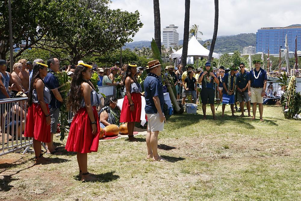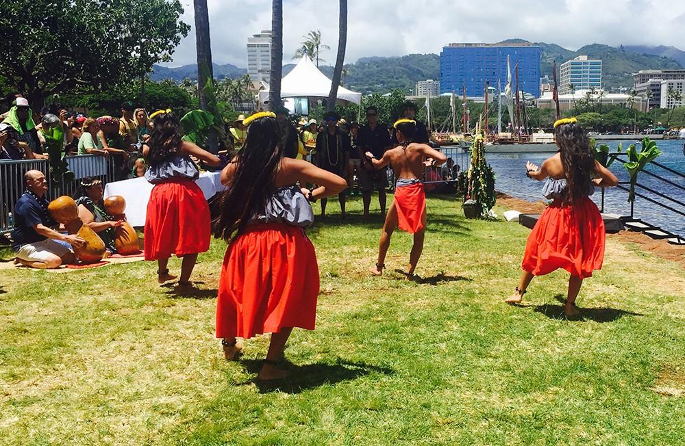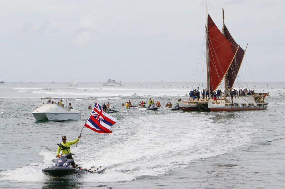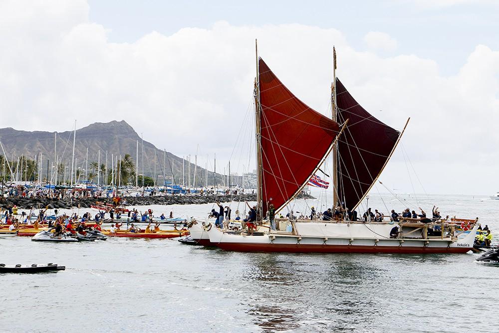 Kamehameha Schools leadership and staff helped to welcome Hōkūleʻa back to Hawaiʻi on Saturday, June 17, after the completions of the Mālama Honua voyage, a three-year voyage that took Hōkūleʻa and its crew around the world. In all, Hōkūleʻa and sister canoe Hikianalia covered a combined 60,000 nautical miles, over 150 ports and 23 countries and territories worldwide. Hōkūleʻa and Hikianalia were escorted into the bay by Magic Island by Nāmāhoe (Kauaʻi), Moʻokiha (Maui), Makaliʻi (Hawaiʻi Island), Hawaiʻiloa (Oʻahu), Okeanos (Marshall Islands) and Faʻafaite (Tahiti), during the arrival ceremony that started at 7 a.m.