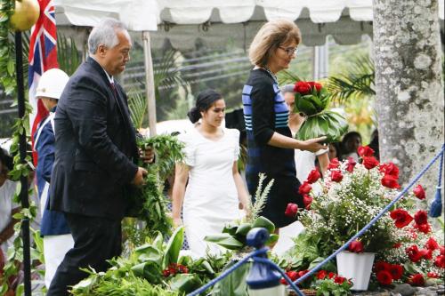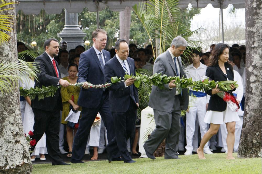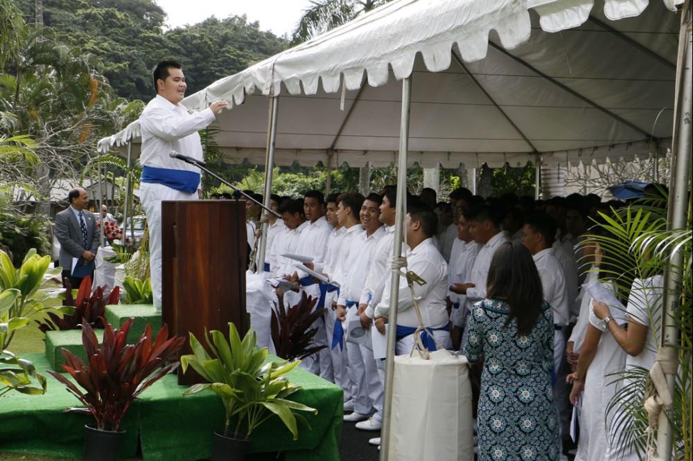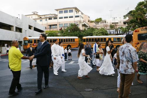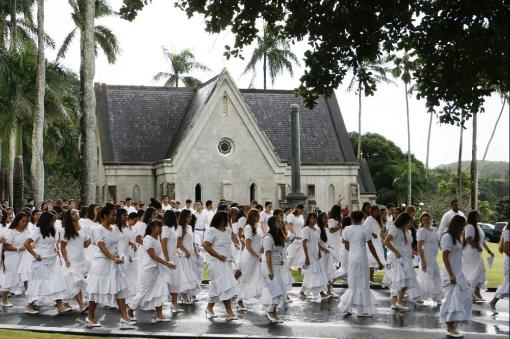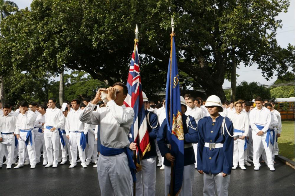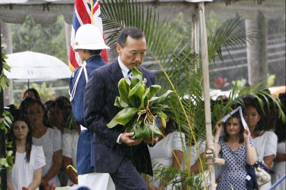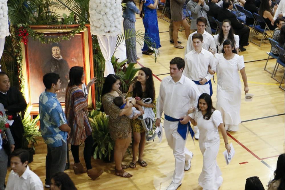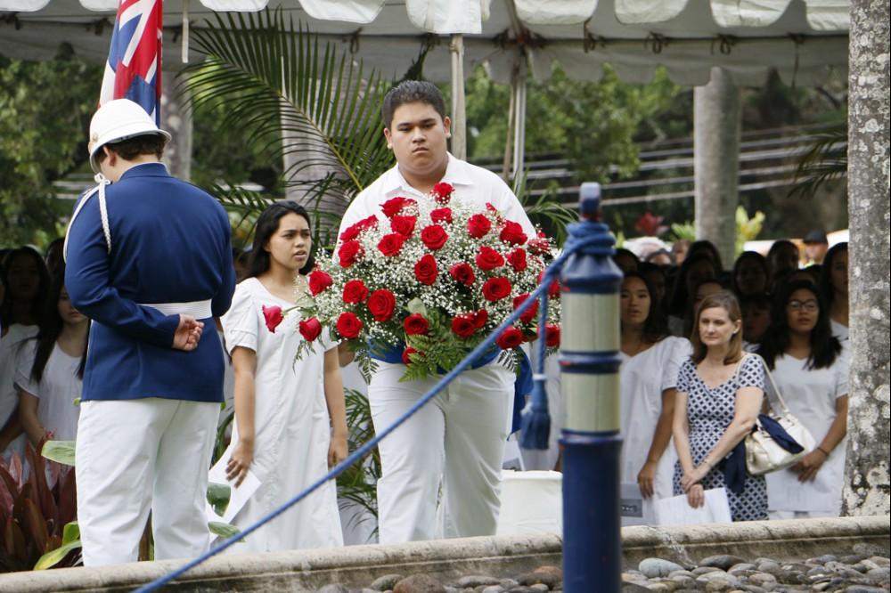 Immediately following the all school programs on campus, the seniors were bussed to the Royal Mausoleum at Mauna ʻAla, where Princess Pauahi was laid to rest. Princess Pauahi was the last in the line of high chiefs and when she died she left her great estate to found and maintain Kamehameha Schools.