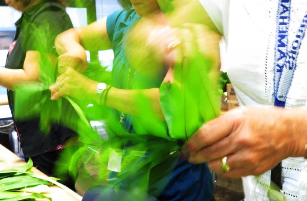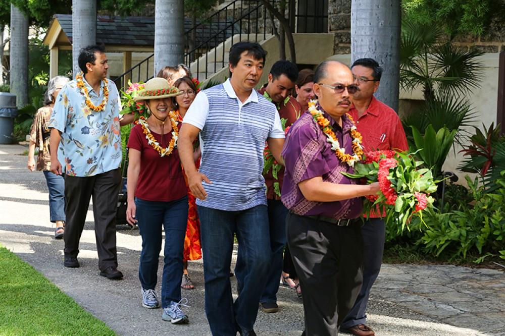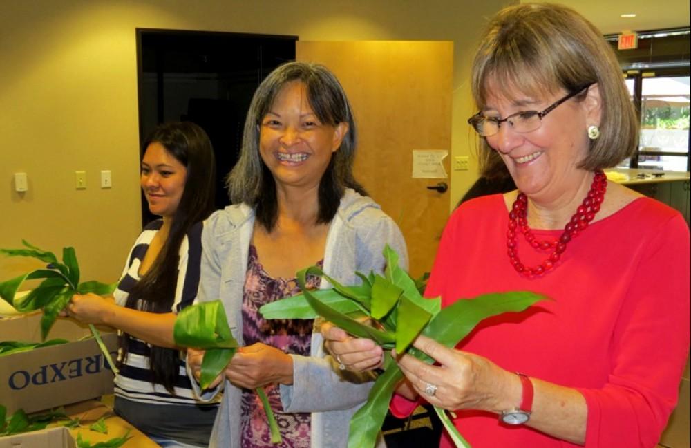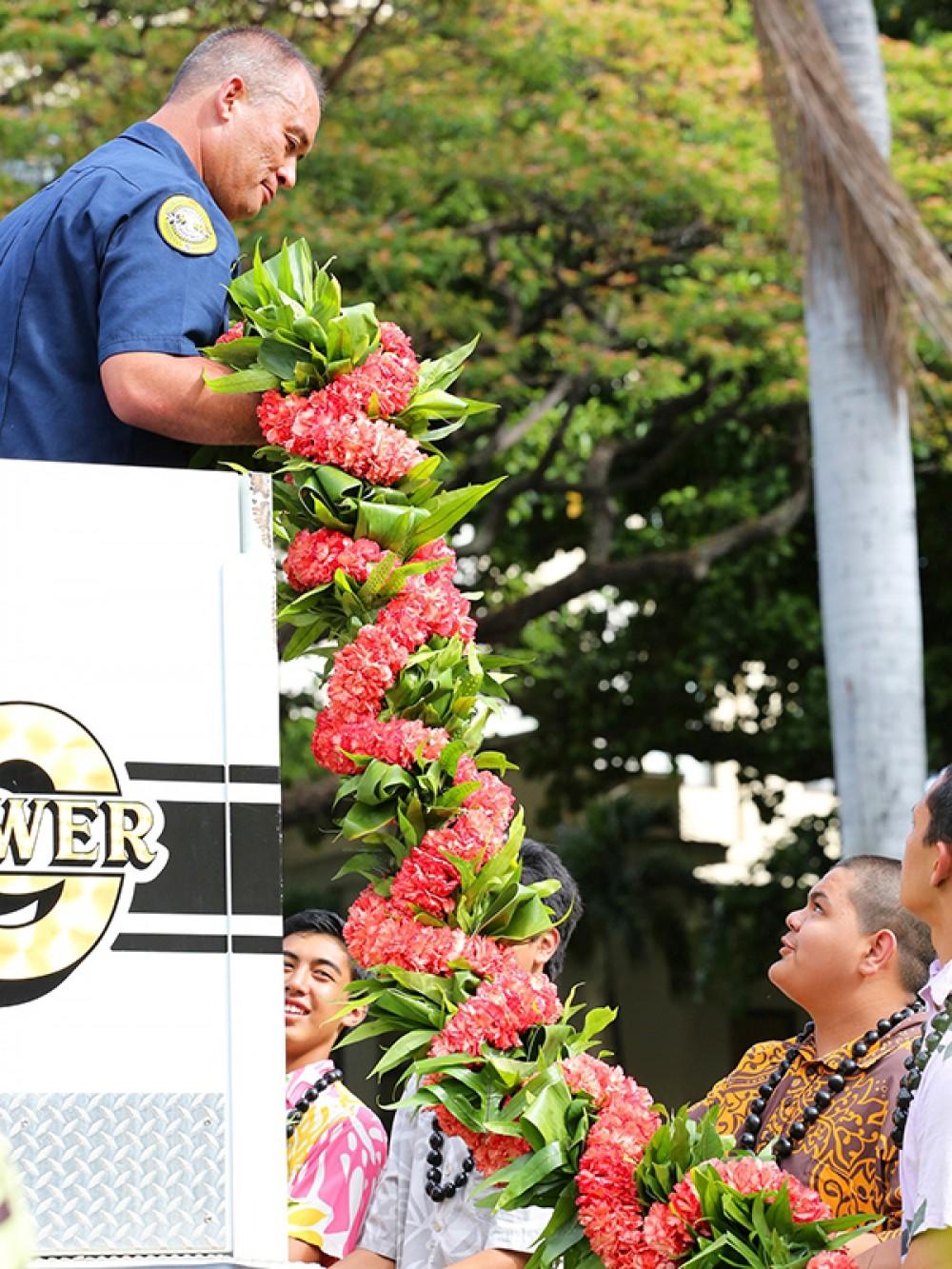 The Finance and Facilities Group coordinated the making of the lei which was fashioned out of laua‘e fern, ti leaves, kukui tree leaves and strands of orange carnations. The carnations represented ‘ilima, the flower of the island of O‘ahu. Both of this year’s King Kamehameha Floral Parade honorees – senators Daniel Akaka and Daniel Inouye – were born on O‘ahu.