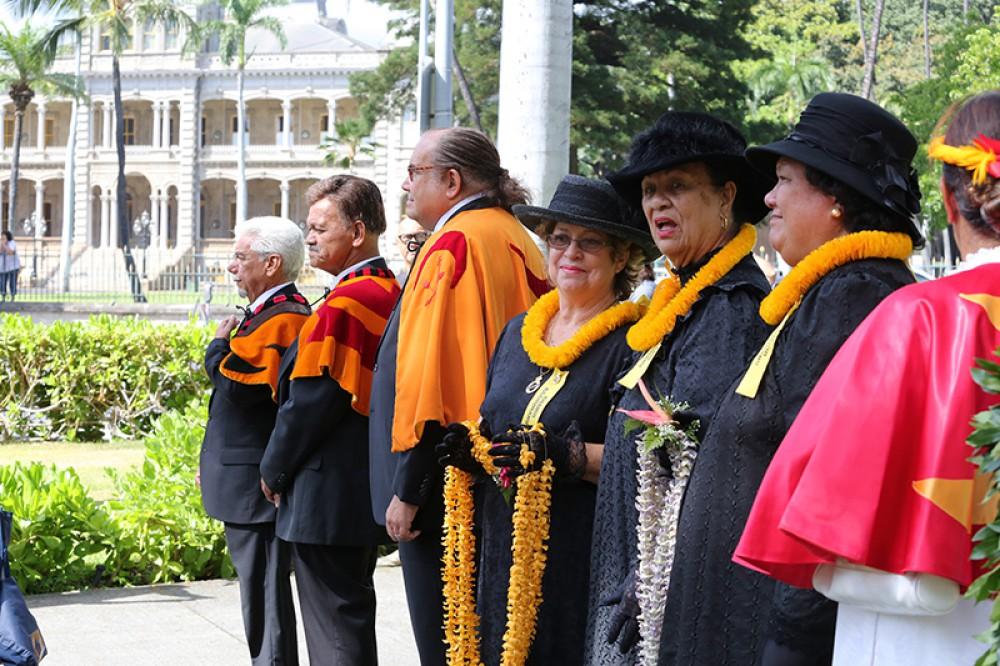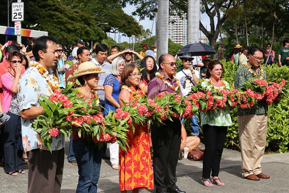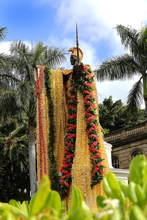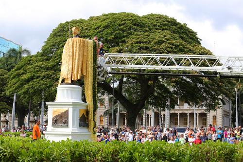 Upon presenting the lei, KS staffers gave a mele oli (melodic chant) entitled “He Mele Lei Aloha no ka Lani Ali‘i.” The chant was written for the occasion by KS education officer Ku‘u Kaulia. KS photographer Larry Racoma captured the following photos of the lei as it made its way to the statue.