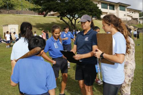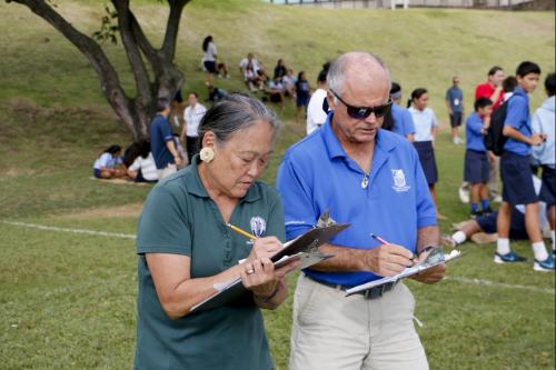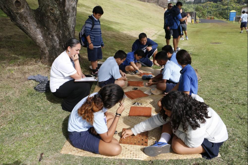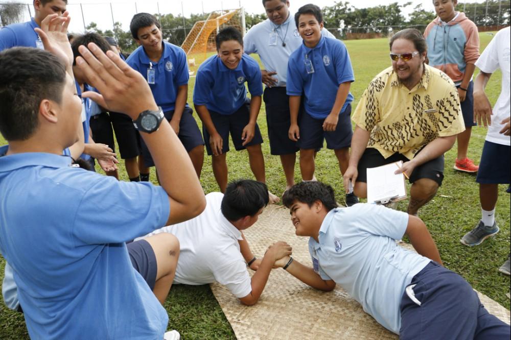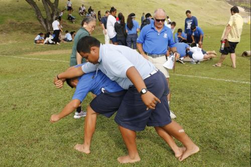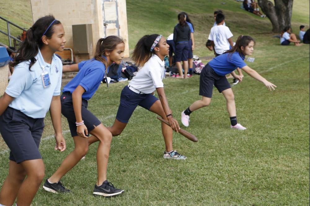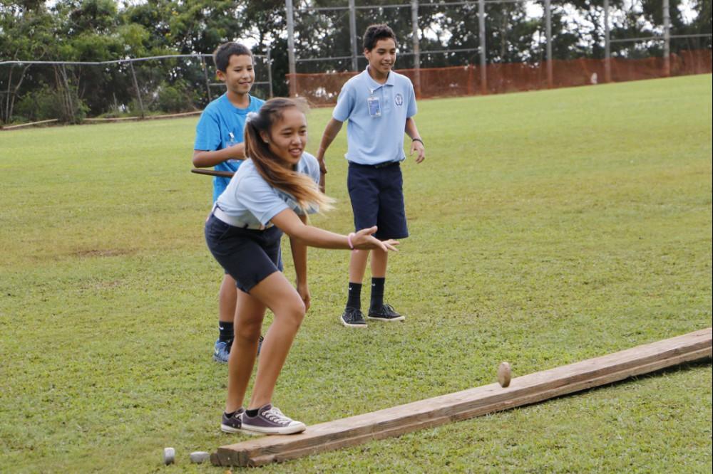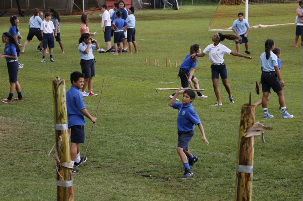 KSK social studies teachers Brad Cooper and Zeoma Akau organize the play-off system. All seventh and eighth grade students participate in ten events including kōnane (Hawaiian checkers), ‘ulu maika (lawn bowling), moa pāhe‘e (dart sliding).