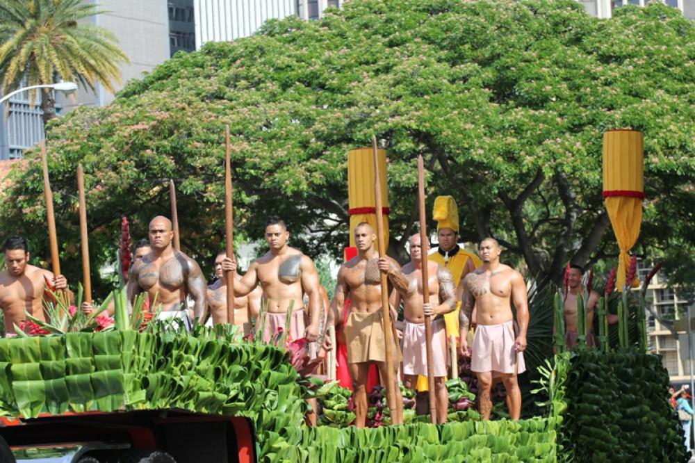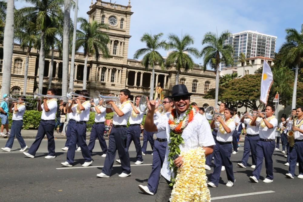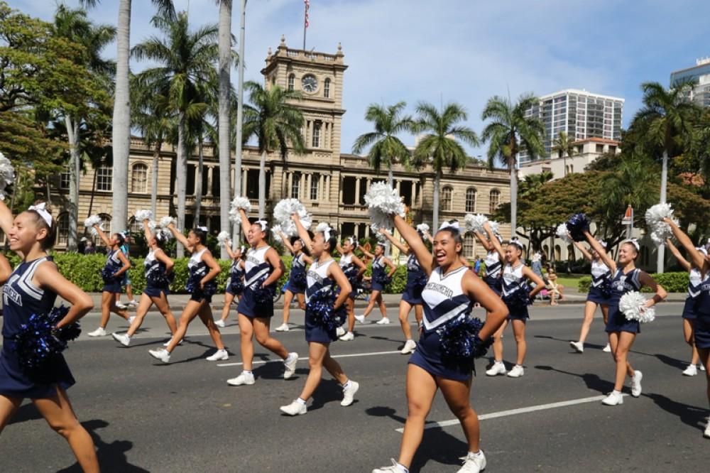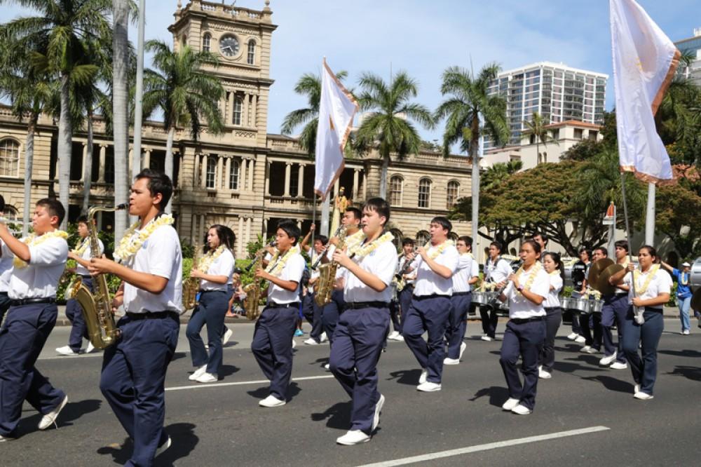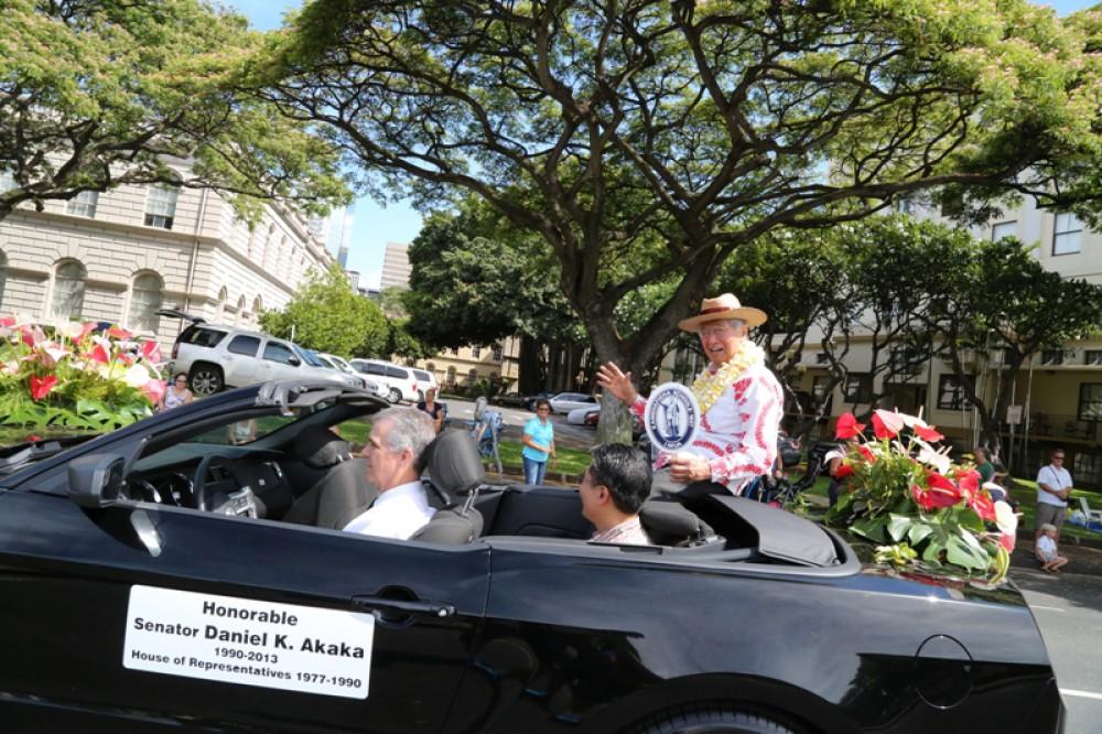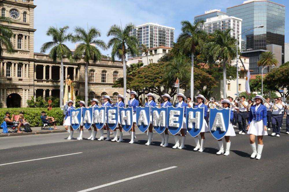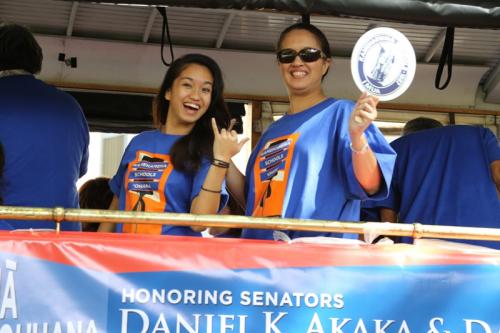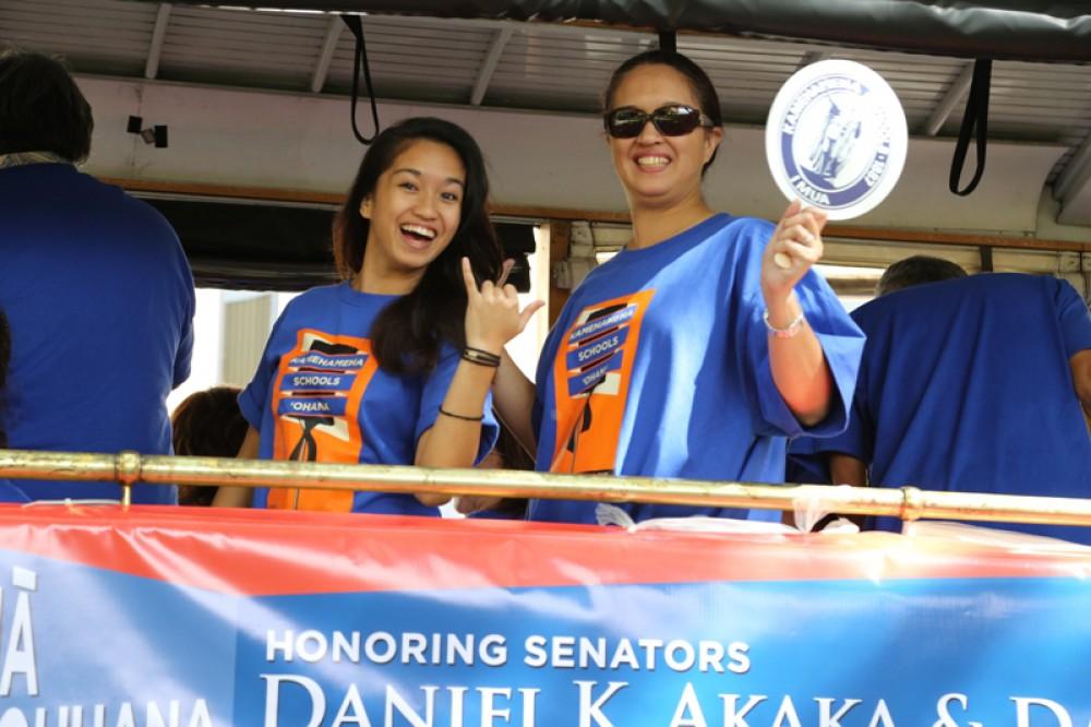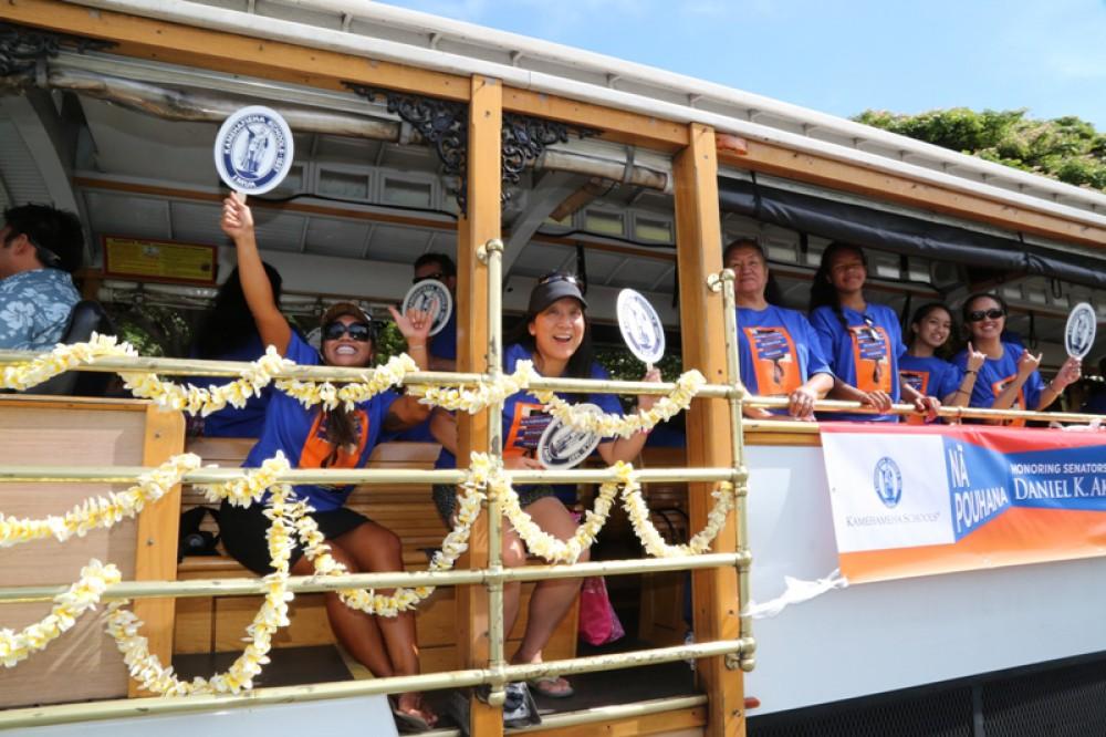 The event honored senators Daniel K. Inouye and Daniel K. Akaka. Senator Akaka, a 1942 KS graduate, rode with the Kamehameha contingent along with a trolley full of staffers, alumni and their families. The illustrious KS Warrior Marching Band and Color Guard anchored the KS group and kept their spirits soaring.