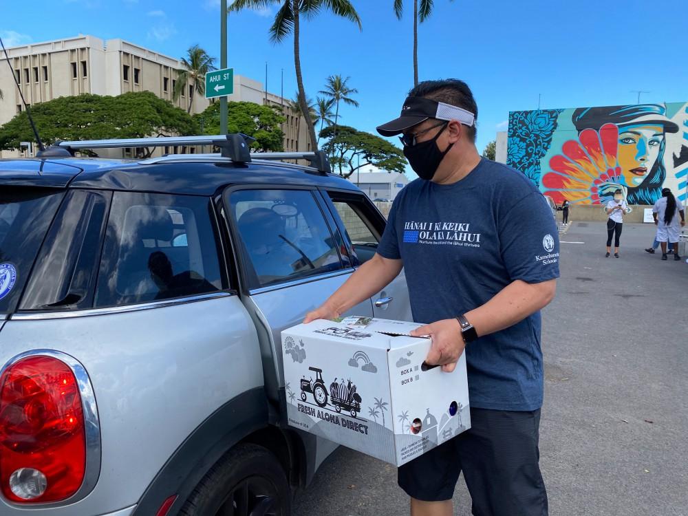 A Kamehameha Schools community partnership has distributed 750 free Kōkua Boxes filled with fresh produce and food items to Kakaʻako restaurant and retail workers impacted by the COVID-19 pandemic. At the inception of the pandemic, Kakaʻako – largely made up of small businesses – was heavily impacted. In June, KS’ Our Kakaʻako, Hawaiʻi Ag & Culinary Alliance, and Ward Village collaborated to provide 250 Kokua Boxes to Our Kakaʻako and Ward Village tenants and their employees. By popular demand, the partnership’s July distribution event gave away 500 boxes. Another produce distribution is scheduled for late August.