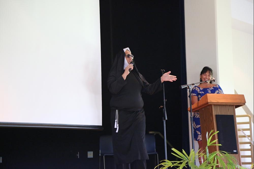 The celebration was highlighted by special appearance by “Sister Mary Clarence” from "Sister Act" fame, who led staffers in a joyous rendition of “Oh Happy Day” with KSH High School Administrative Coordinator Kelly-Jean Grahovac on lead vocals and Elementary Music Teacher Cindy Debus on the piano.