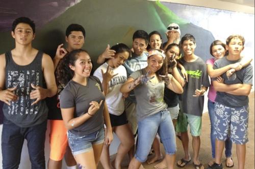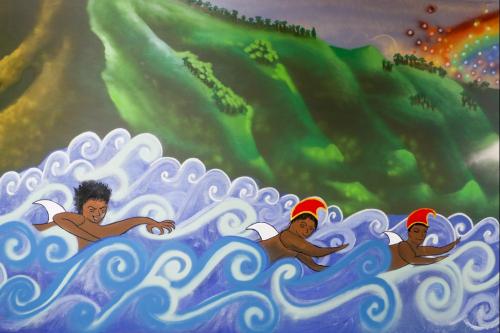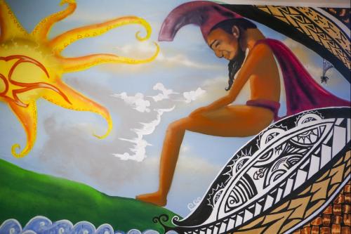 The mural illustrates the romance of the beautiful chiefess Lāʻieikawai, her fall from grace, and her final deification among the gods. Students were guided by the expertise of urban artist John “Prime” Hina of 808Urban.