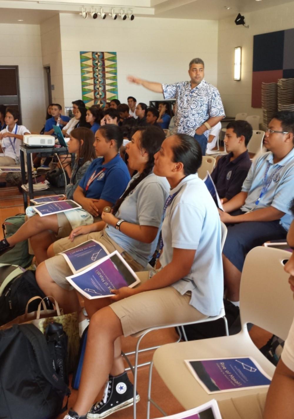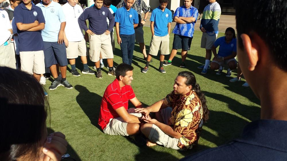 They attended a class on Hawaiian food preparation, making and tasting a healthy limu salad. A second offering was a presentation on the history of Makahiki, including a fun and engaging trivia game called, “You Don’t Know Lono.” The game required the students to draw on their knowledge of Hawaiian history and culture. Their visit concluded with the physical challenge of learning and competing in honuhonu, a seated wrestling game.