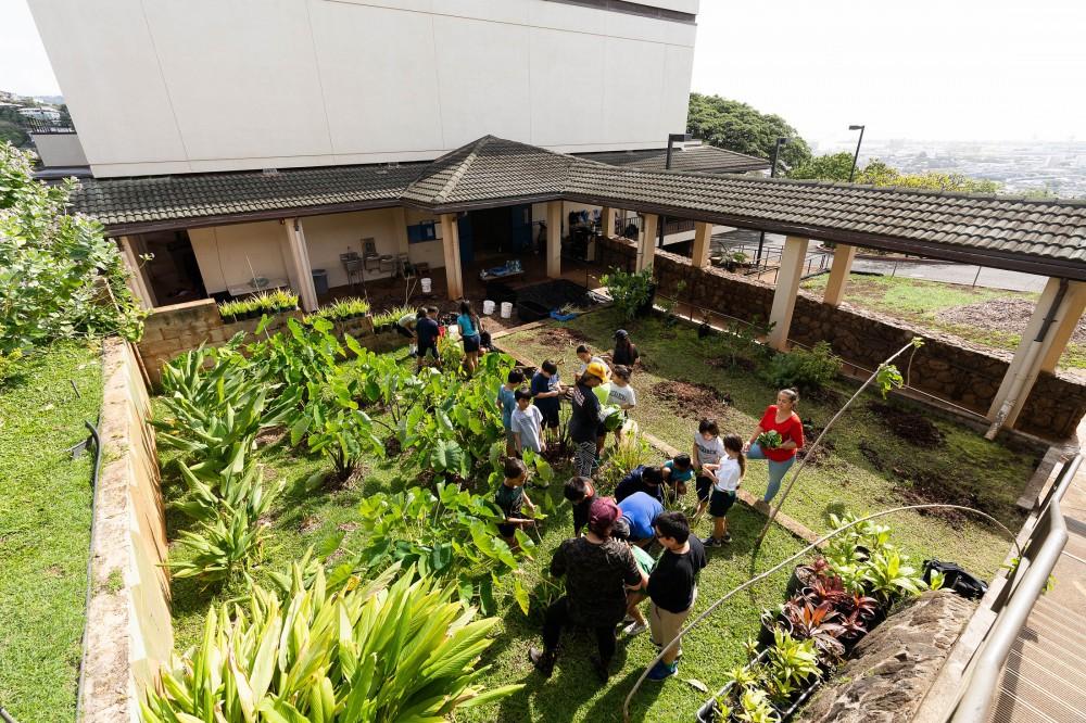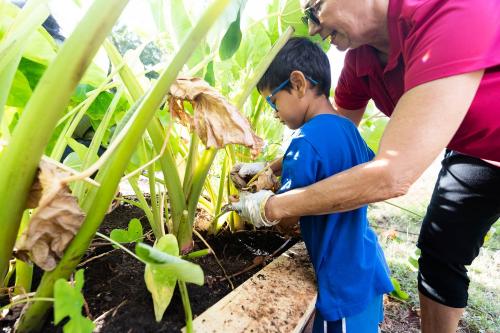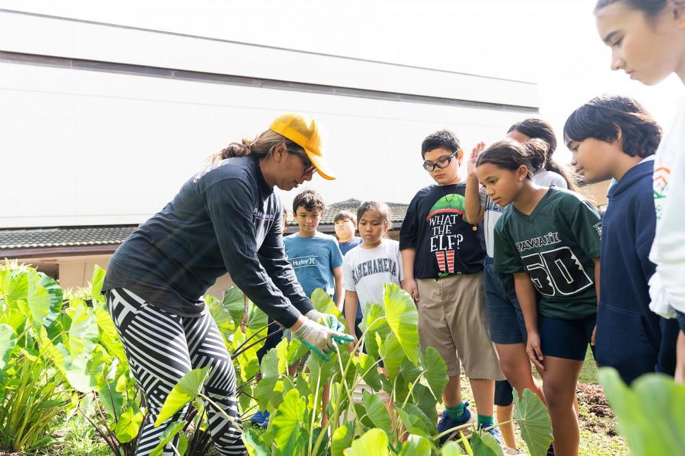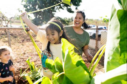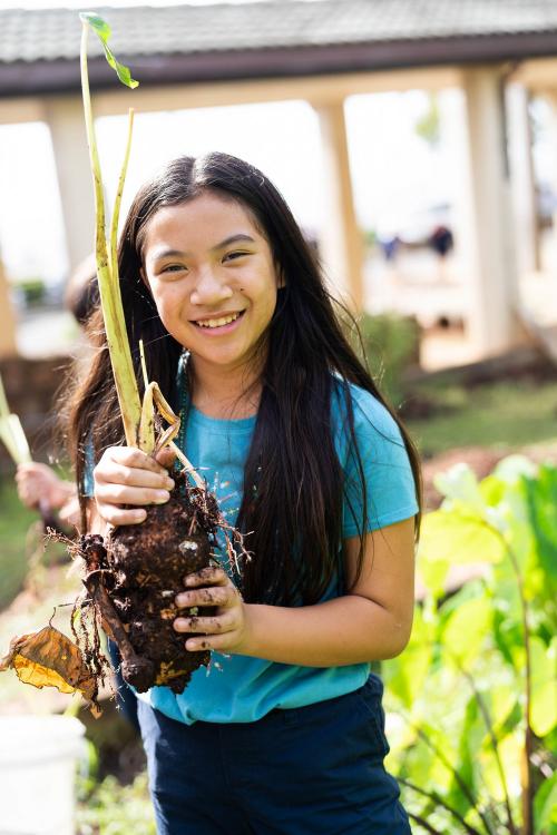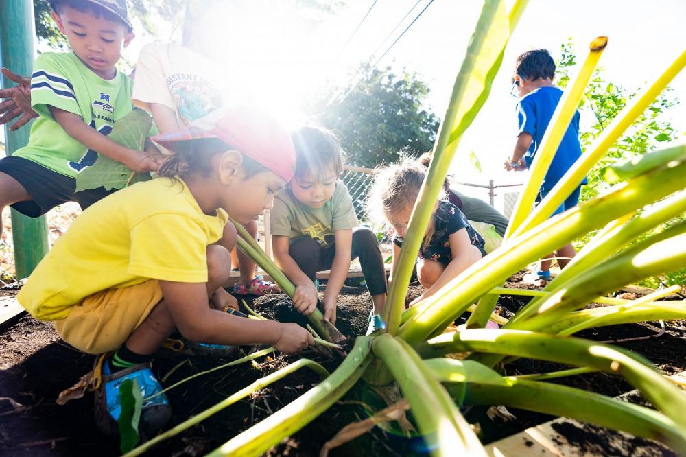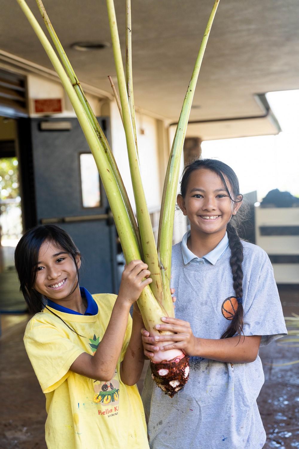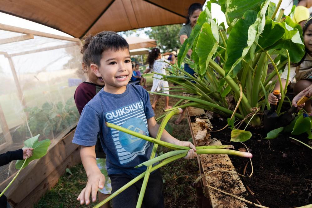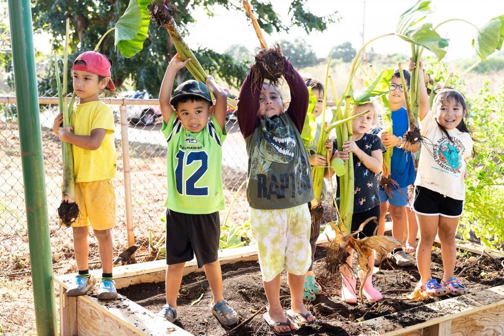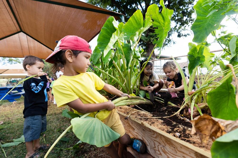 Kamehameha Schools Kaumankani Preschool and KS Kapālama Elementary School keiki had hands-on lessons in aloha ‘āina recently when they practiced huki kalo – pulling taro – on their campuses. Muddy hands and feet made for a deeper understanding of their native culture.