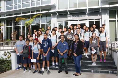 The haumāna started their day at Kawaiahaʻo Plaza and joined staffers for morning gathering. A few students offered pule and manaʻo before the group headed to Our Kakaʻako. Guest speakers and site visits included Monica Toguchi, owner of Highway Inn; Frank Rodriguez and Mark Toohey, representatives from Locations Hawaiʻi touring the Flats at Puʻunui; Al Guzman, general manager of The Collection; Jasper Wong, founder of POW! WOW! Hawaiʻi; Gary Evora, KS commercial real estate senior asset manager; Amy Brinker, KS sustainability manager; Gabe Amey, founder of RISEHI; Irie Love, singer and songwriter; and Austin Kino, voyager on the Hokuleʻa.