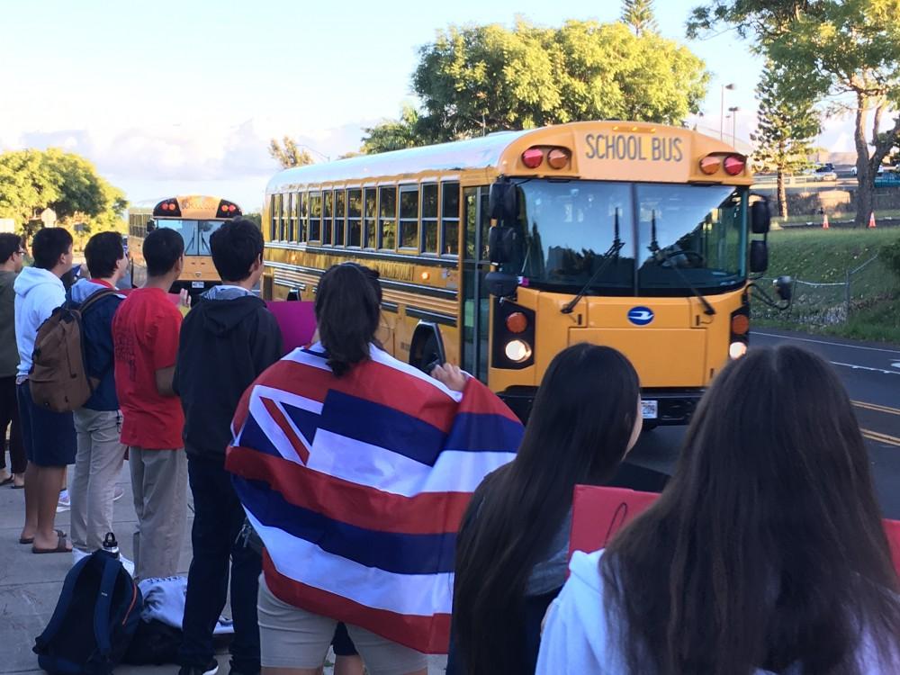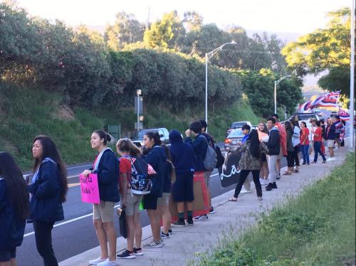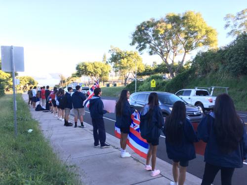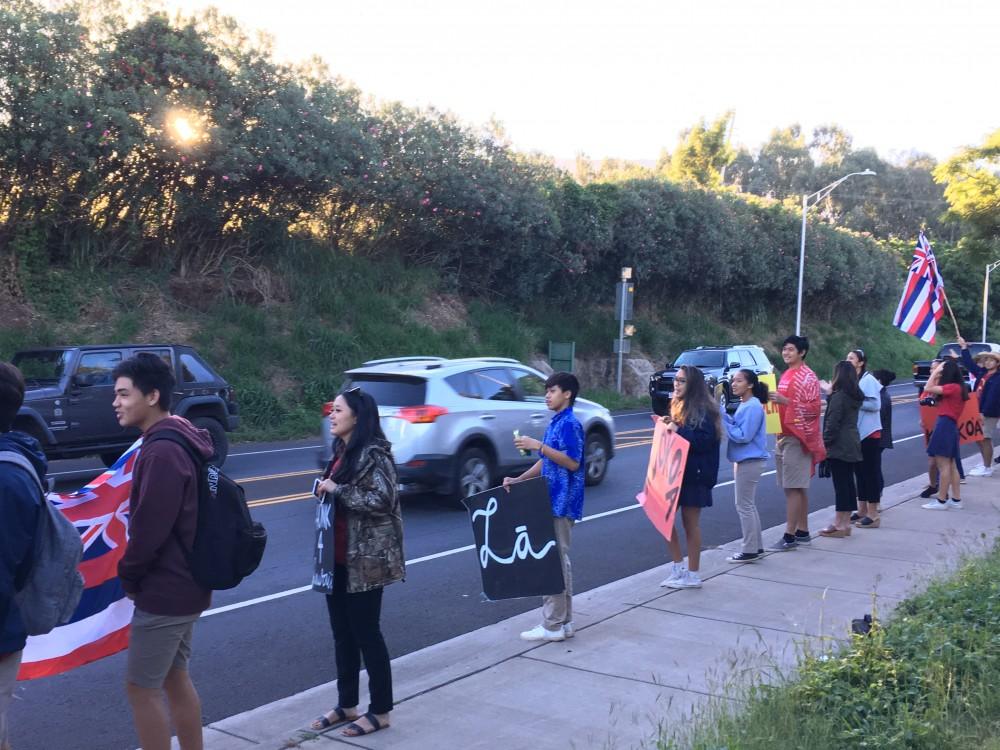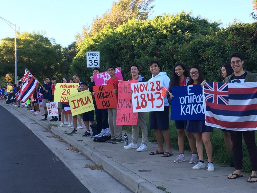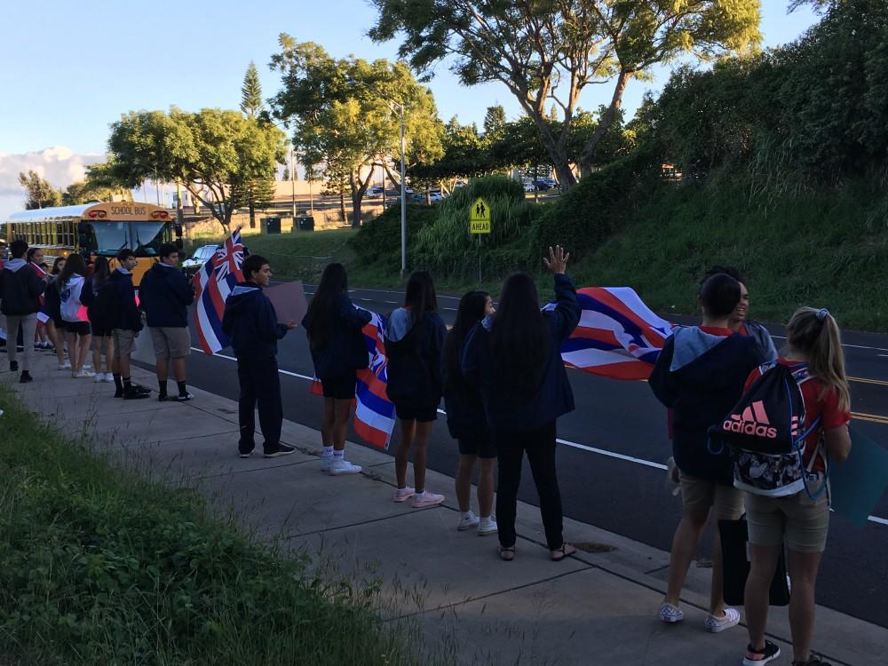 KS haumāna wave signs to passing cars for the 174th Lā Kūʻokoʻa, Independence Day.