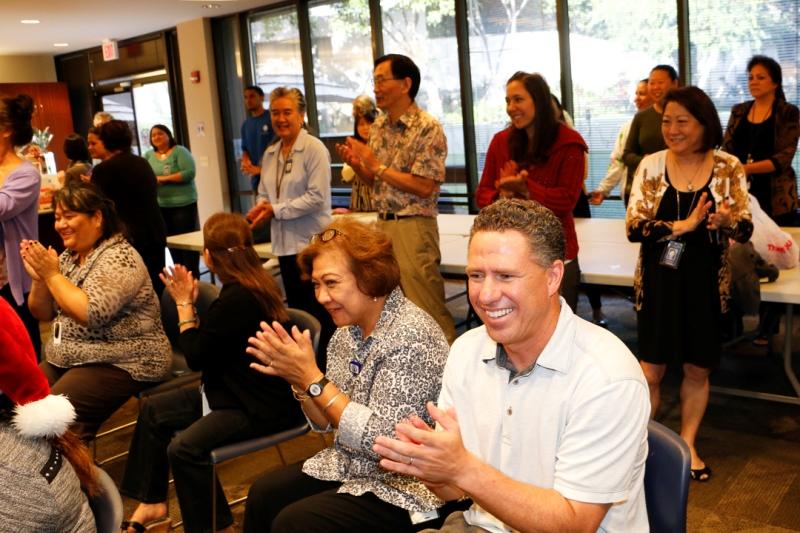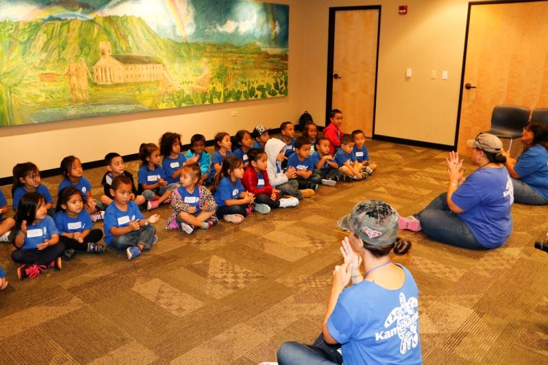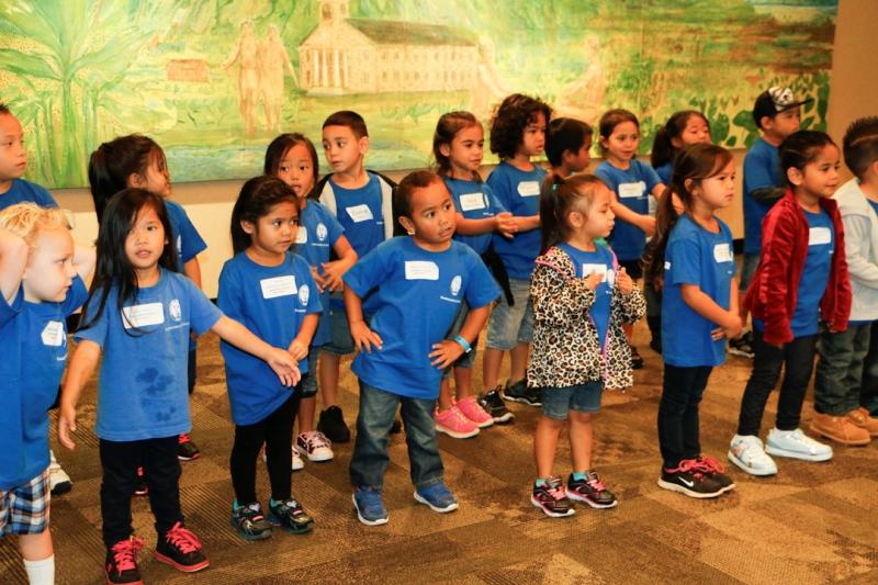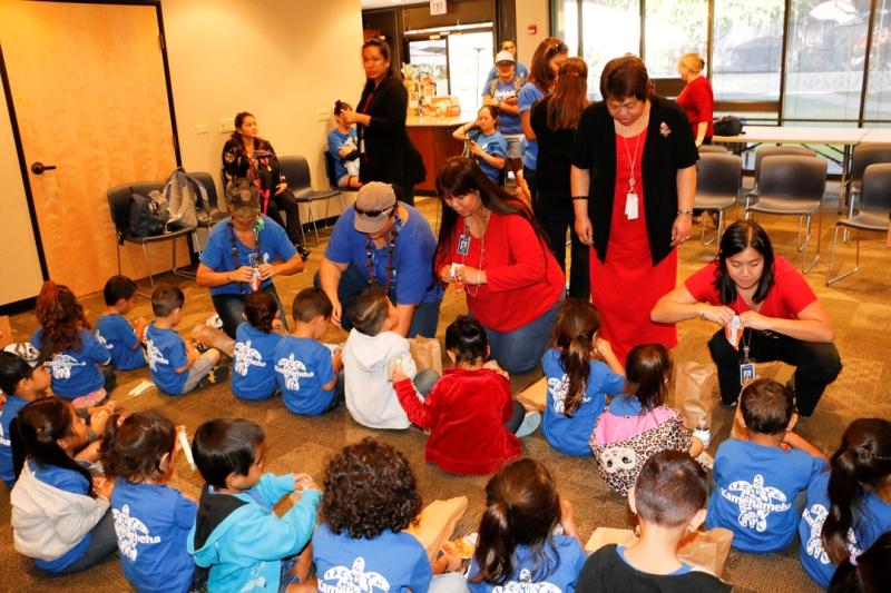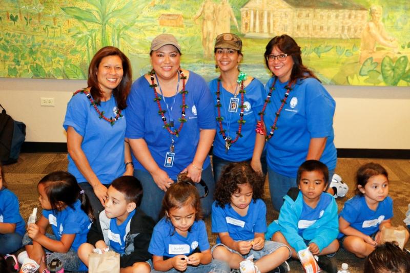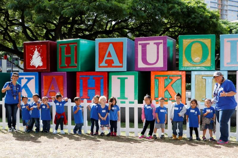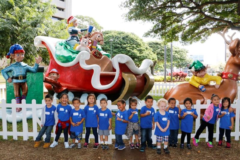 More than 40 keiki from Kamehameha Schools’ newest preschool paid a holiday visit to the organization’s corporate headquarters at Kawaiahaʻo Plaza in Honolulu. The Mā‘ili Preschool keiki were accompanied by kumu, parents and grandparents. After visiting with KS staffers, they walked across the street to view the Christmas decorations at Honolulu Hale.
