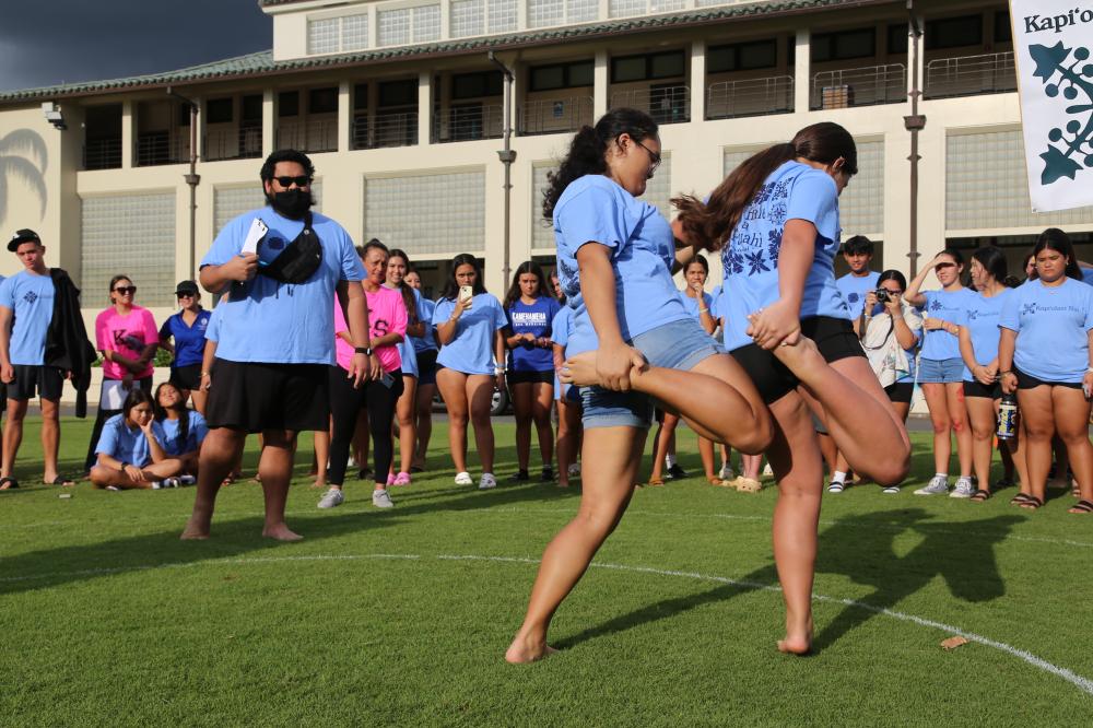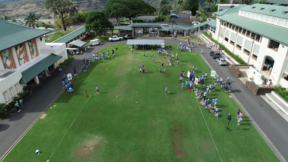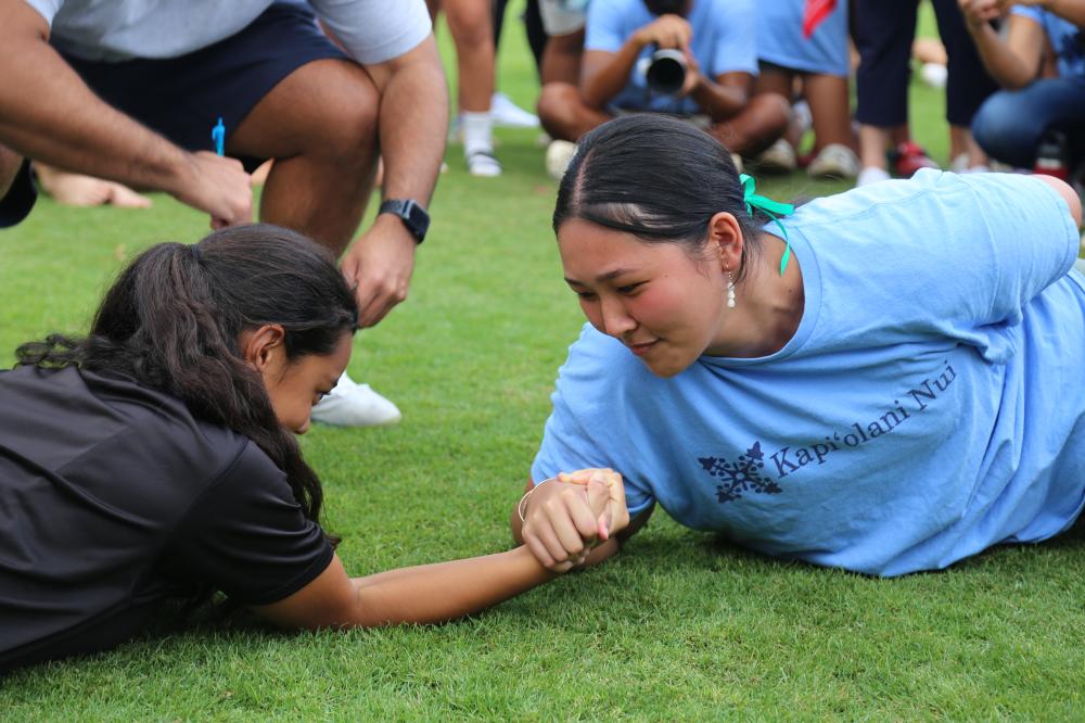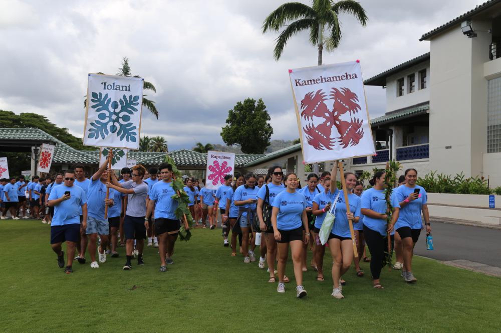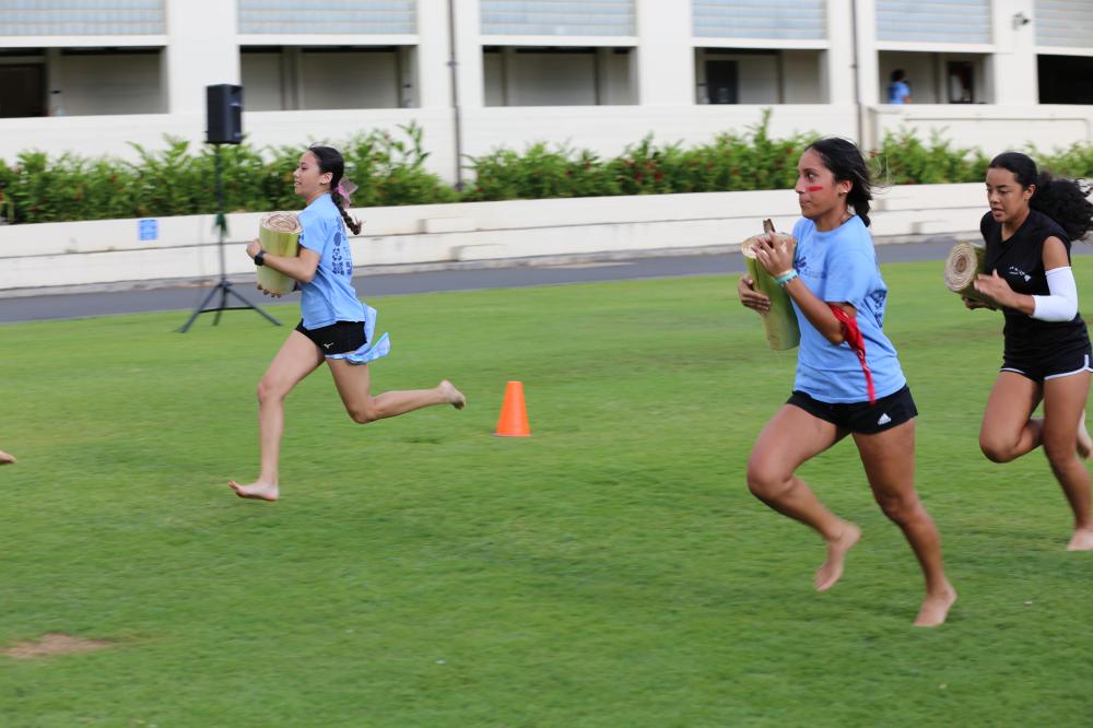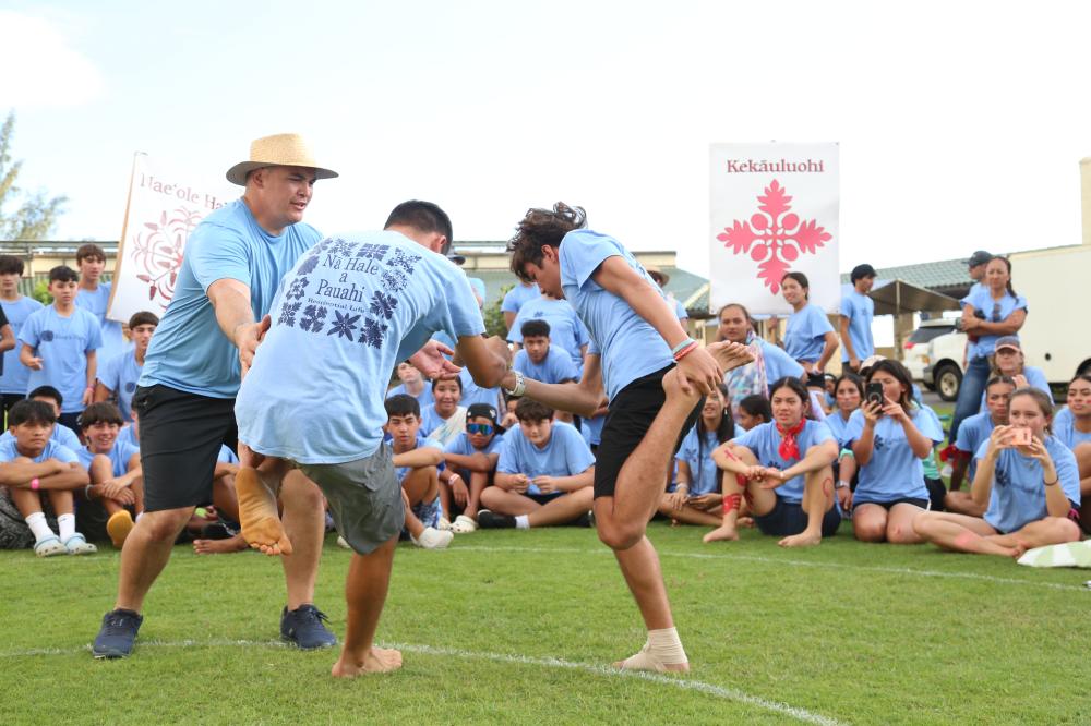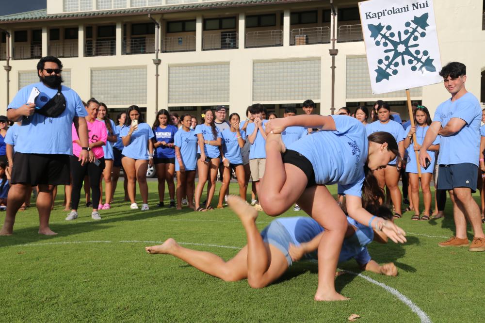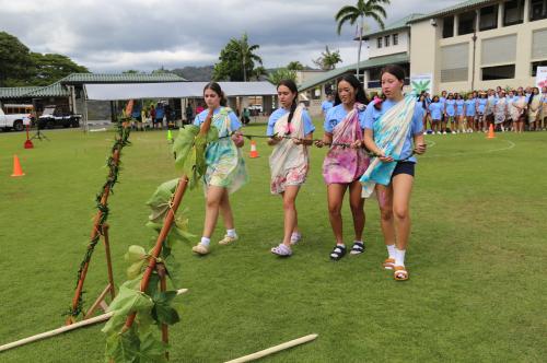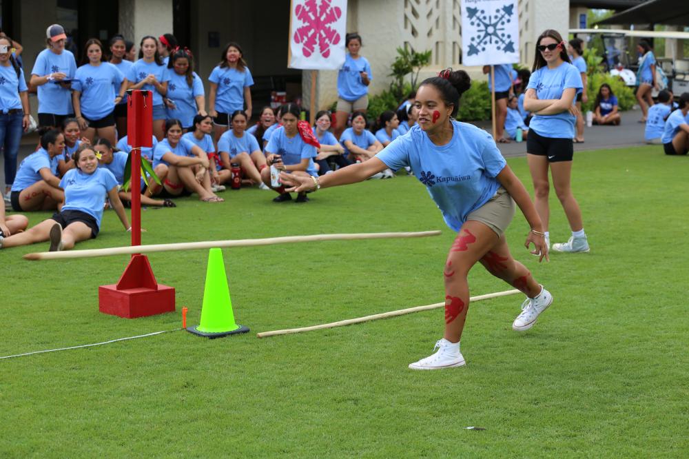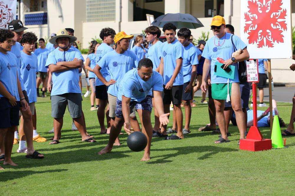 Makahiki season got off to an early start on Oct. 25 at Kōnia Field on the KS Kapālama campus as about 300 haumāna competed in the Makahiki games. Representing their individual hale, middle and high school haumāna competed in various games, including: hoʻokaʻa pōhaku (rock rolling – with a large heavy ball), ihe pāheʻe (spear sliding), ʻulu maika (disc rolling), moa pāheʻe (dart sliding), ʻōʻō ihe (spear throwing), kūkini loa (long distance race), kūkini poko (short distance race), kūkini hui (relay), haka moa (standing chicken fight), uma (arm wrestling) and hukihuki (tug of war).