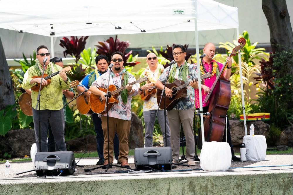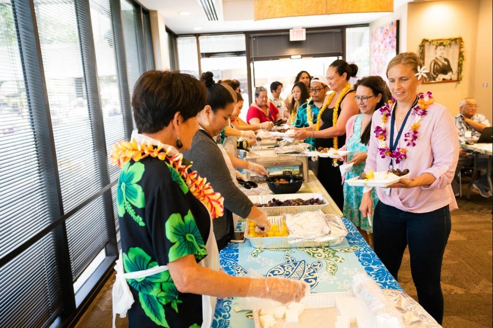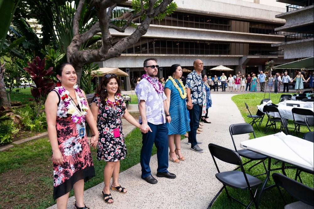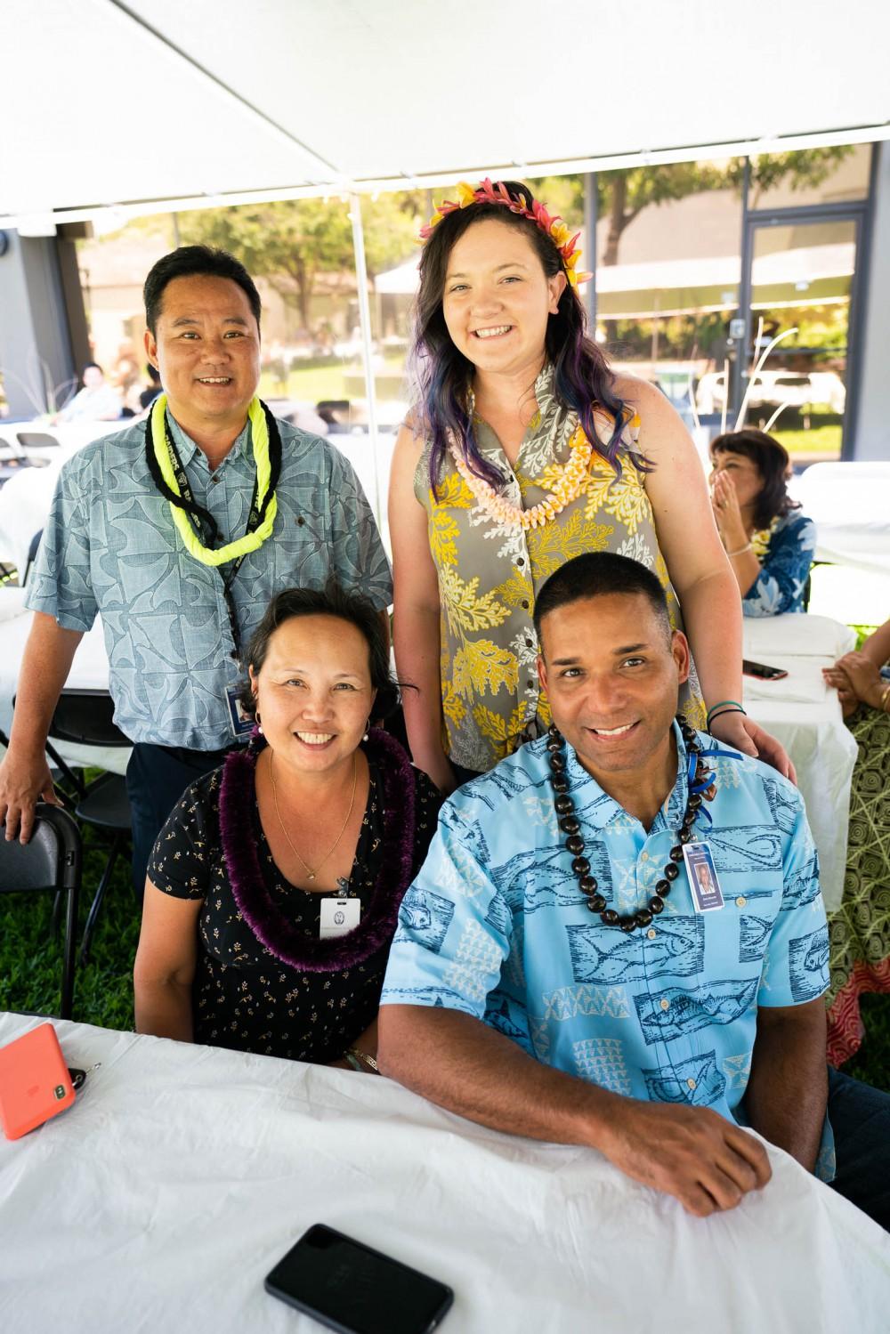 Kamehameha Schools ’ohana from KS Kapālama and Kawaiahaʻo Plaza gathered in celebration of May Day with the theme of “Nā Kini Pua Lei Aloha, The Many Lei of Aloha.” Held on the great lawn, staff were treated to lei making, a Hawaiian plate, and live Hawaiian music and hula from our very own employees. It was a beautiful day as we continue to build pilina with others and celebrate the many lei of aloha.