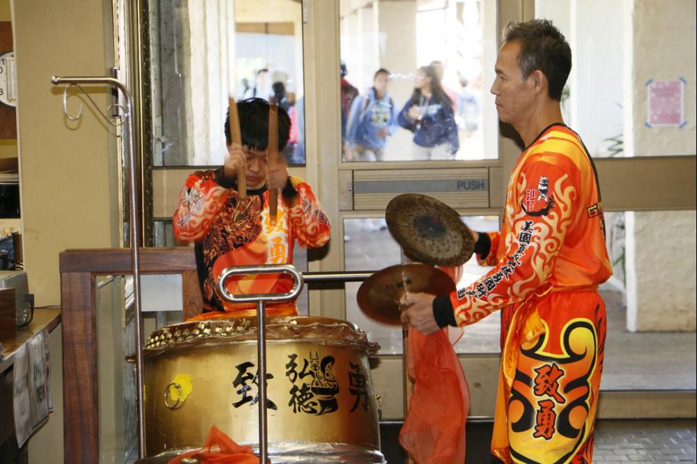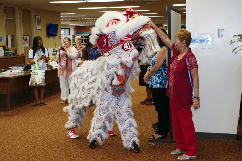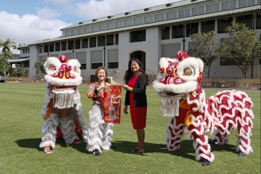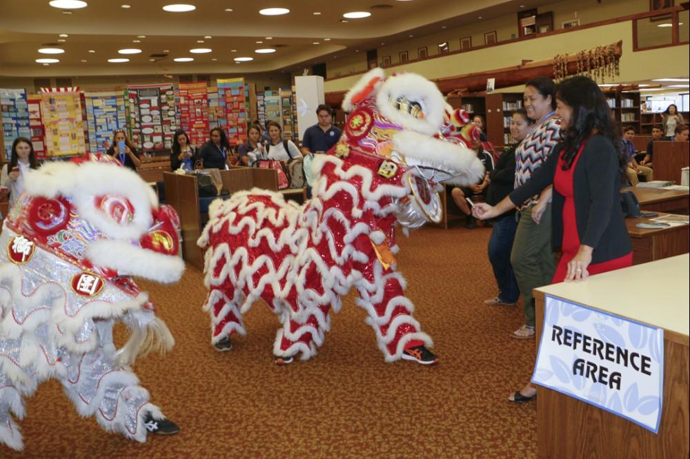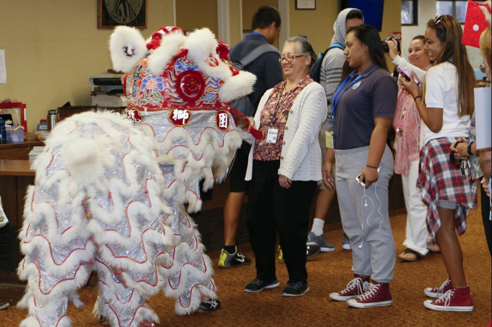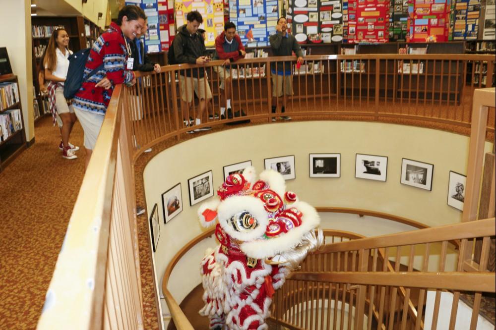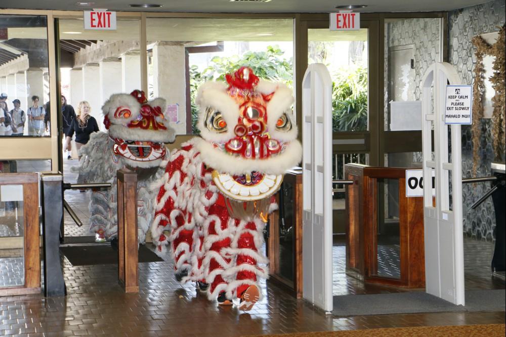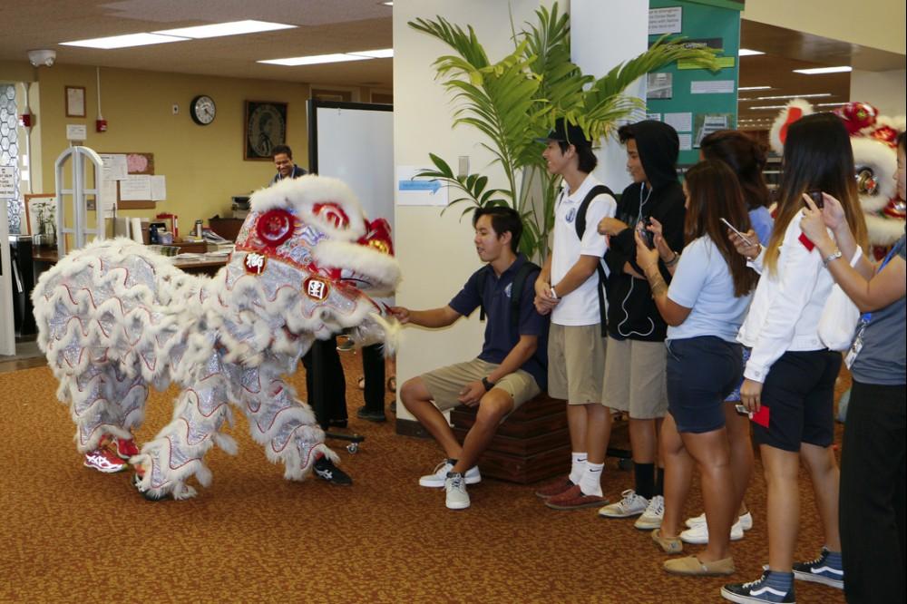 Kung Hee Fat Choy! Happy Chinese New Year! The Kapālama campus Midkiff Learning Center staff recently invited a pair of Chinese lions from the Gee Yung Martial Arts Dragon and Lion Association to perform the choy cheng, or traditional Chinese lion-dance blessing for the building. Students and staff were given the traditional red envelopes, lai see, containing a small amount of money to feed the lions. Senior Paige Change is a member of the Chinese lion dancing group and helped to make the event possible.
