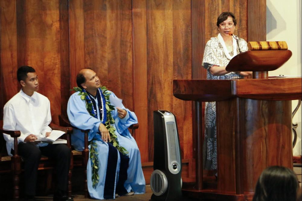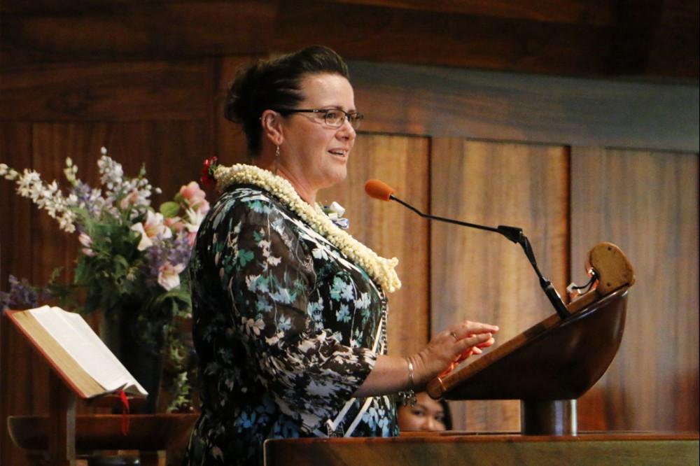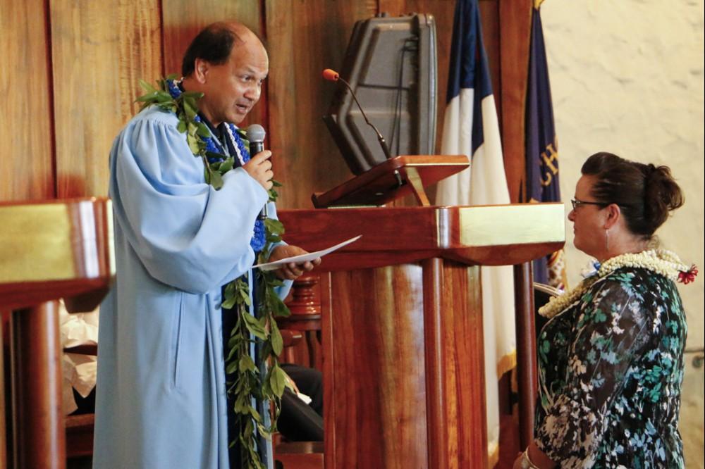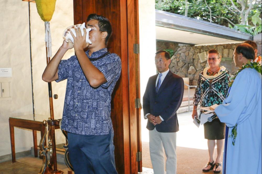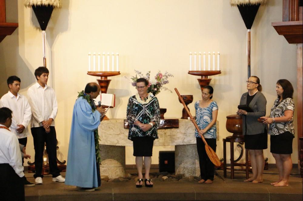 A welcome ceremony and blessing for new KS Kapālama High School Principal Sheena Alaiasa was held at the campus' Bishop Memorial Chapel on June 1. Alaiasa and her family were introduced to the campus staff in the ceremony that featured the presentation of the symbols of Kamehameha Schools: a canoe paddle, a koa bowl and a bible.