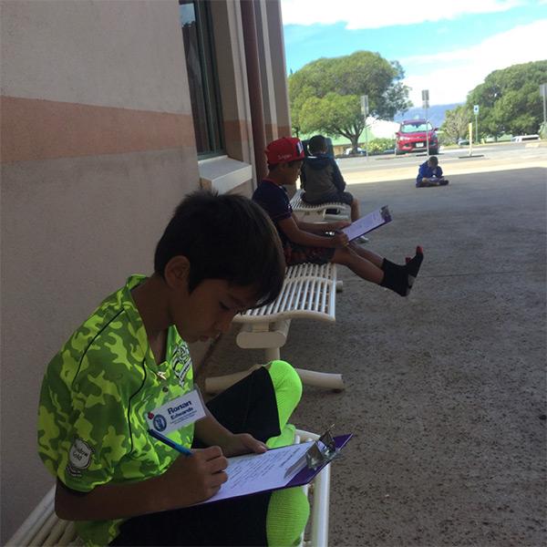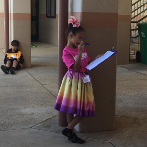 *Papa ʻEkolu are getting maʻa (used to) to Kumu Kauʻiʻs Papa Hawaiʻi where they are learning lots of new oli and taking kuisa (quiz) for all of them; both written as well as oral. The Haumāna studies very hard and here you will see how they work on kuisa outside of the papa; enjoying our beautiful schoolʻs landscape as well as pleasant weather.