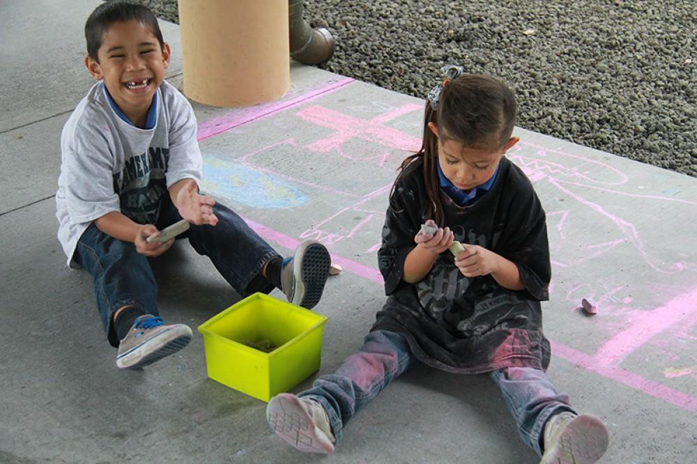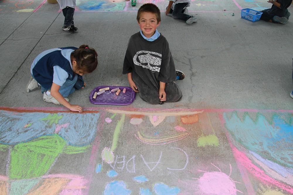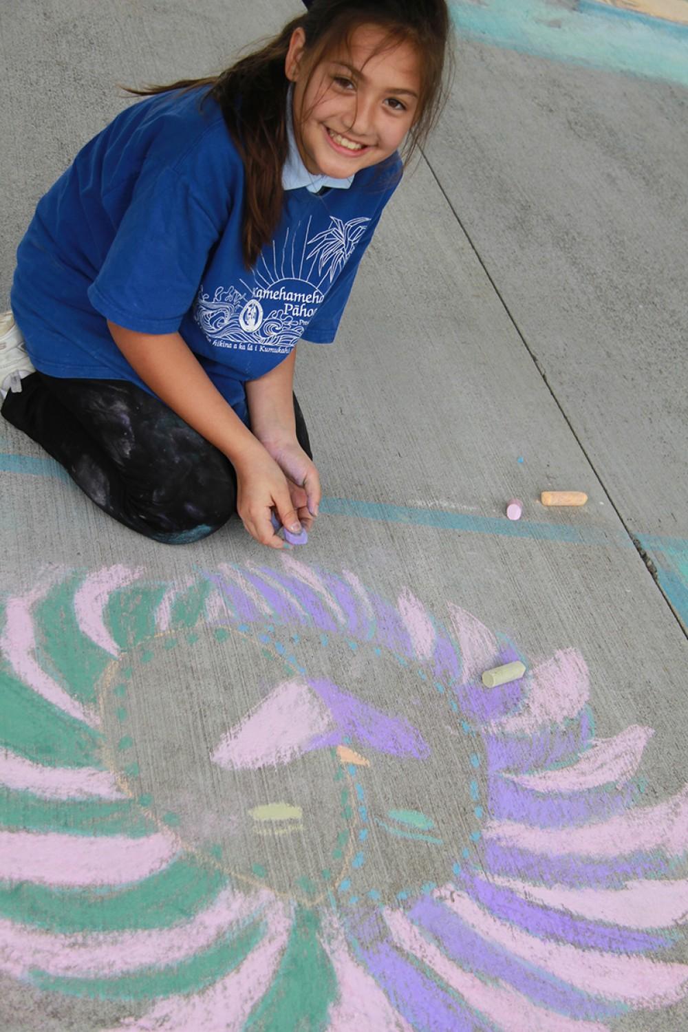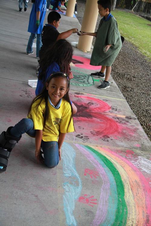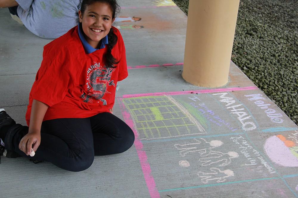 Kamehameha Schools Hawai‘i Kula Ha‘aha‘a (Elementary School) students celebrated Youth Art Month using sidewalk chalk and their creativity to brighten the walkways of their campus. Art kumu Tana Rosehill has coordinated the colorful festivities for three years straight.