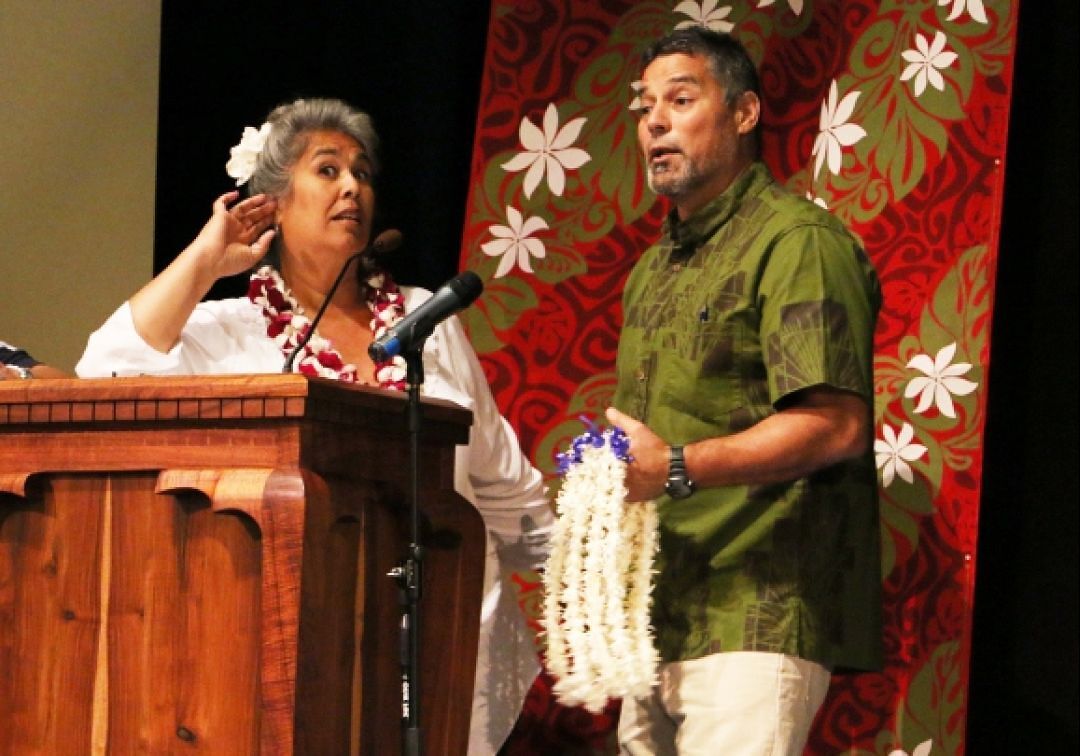 Newly named Education Safety and Risk Manager Carl Alexander (r) teamed up with KS Maui Hawaiian Protocol Facilitator Ekela Kaniaupio-Crozier to host the campus' recent service awards ceremony.