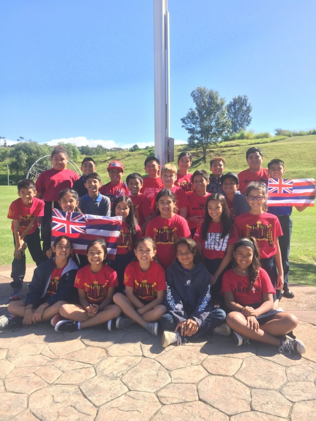 Students from papa ʻelima celebrate independance day in front of the only flag flying that day. Our beloved hae Hawaiʻi