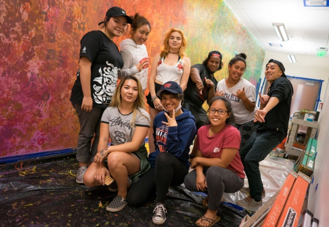 Kauhale Digital Media interns from Waiʻanae High School added their spirit to the mural project at KS’ Community Learning Center at Māʻili. They were among more than 150 preschool keiki, ‘ōpio (youngsters), community members, and staff members who contributed to the kākou effort.
