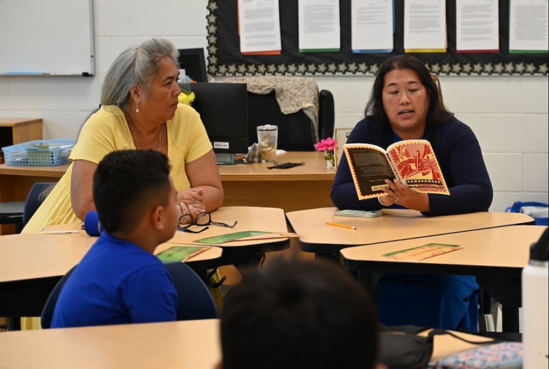 “Your kumu invited me to come read to you today. And I brought along my friend,” Kaniaupio-Crozier said, gesturing to Kumu Kanoelehua Kamaliʻi-Ligsay, also an HCBE coordinator, sitting beside her.