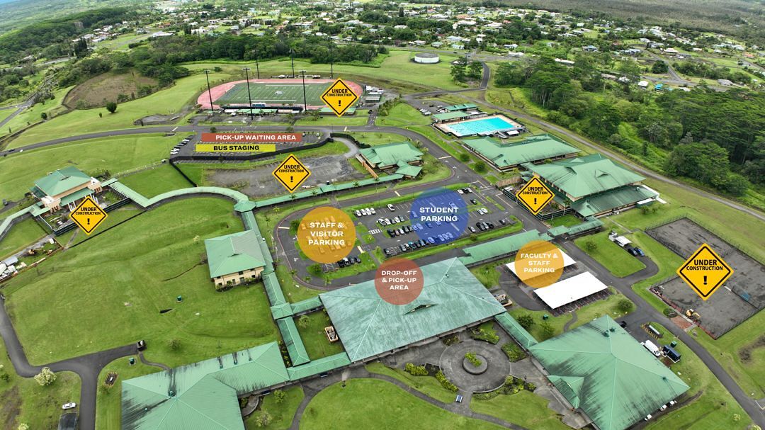 To accommodate the temporary loss of the student parking lot for the first half of the school year, adjustments are being made to relocate student parking to the visitor and staff parking lot in front of Koaiʻa Gymnasium. Students should only park in their designated spaces which are reserved until 3 p.m. on school days. Students will need to apply for one of the available stalls and will be selected according to different criteria including distance traveled, if the student is on a modified schedule, family work schedules, and more.