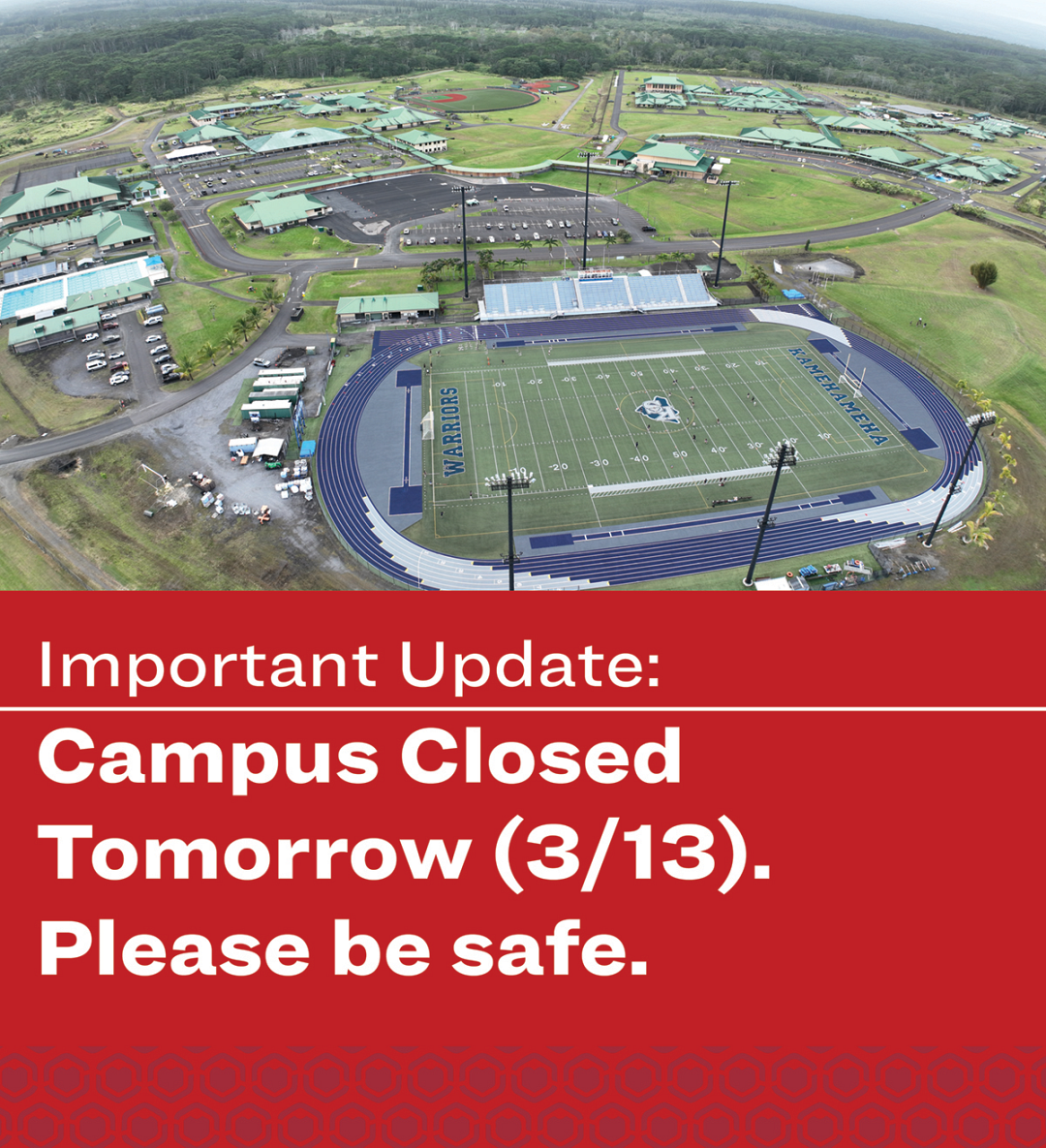 The safety and well-being of our haumāna and campus community remain our highest priority. We encourage all of our ʻohana to stay safe, remain attentive to weather conditions, and take the necessary precautions for your families and homes.