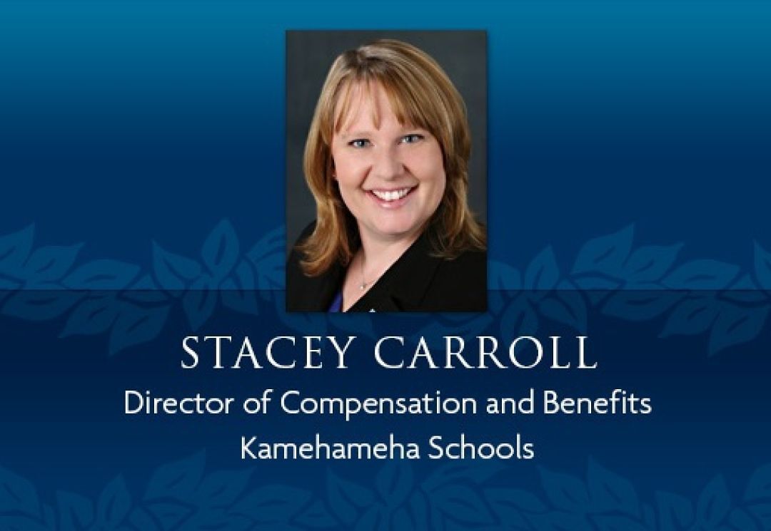 Stacey Carroll has joined Kamehameha Schools as director of compensation and benefits and will oversee compensation, benefits, workplace wellness, and rewards and recognition. Her first day on the job will be Monday, August 25.
