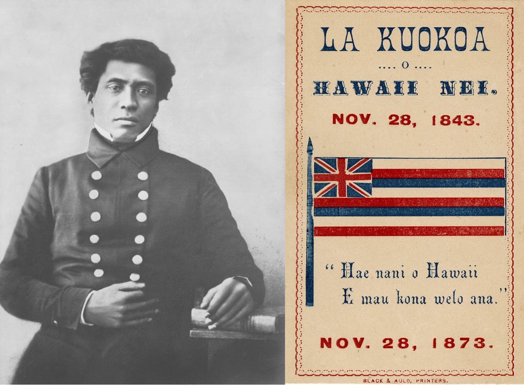 Left: Royal Emissary of the Kingdom of Hawaiʻi Timoteo Haʻalilio, Courtesy of Hawaiʻi State Archives. Right: A flier printed in 1873 for the 30th anniversary of Lā Kūʻokoʻa. Courtesy of the Bernice Pauahi Bishop Museum Archives.