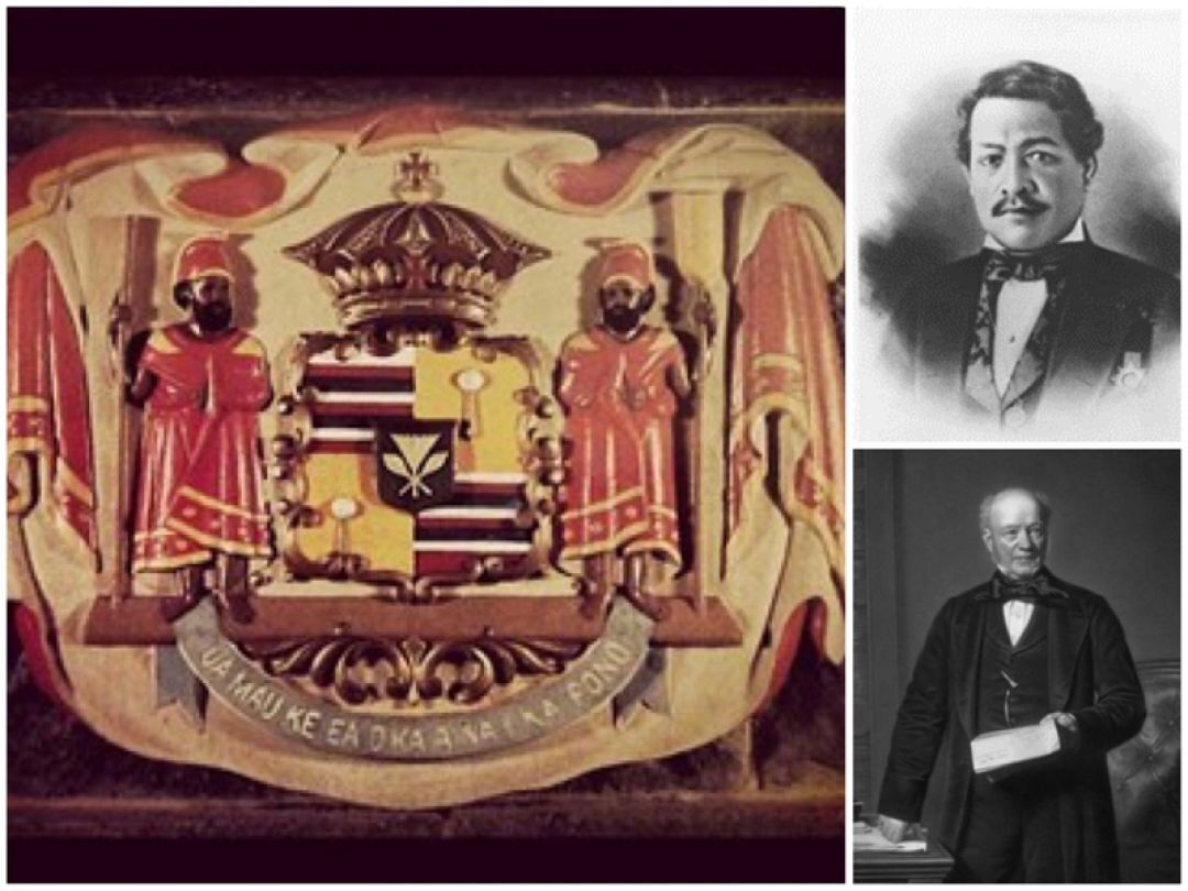 The day Hawaiʻi’s sovereignty was returned, Kamehameha III spoke the words that would become Hawaiʻi’s motto, seen here on its official seal: “Ua mau ke ea o ka ʻāina i ka pono” (The life of the land is perpetuated in righteousness.) Images (top right): Kamehameha III, (bottom right): Sir George Simpson of the Hudson Bay Co.