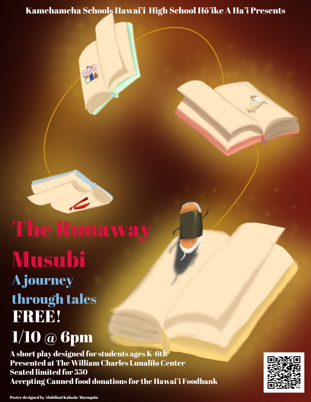 Hōʻike a Haʻi will present "The Runaway Musubi: A Journey Through Tales" on Friday, January 10 at 6pm. The show is a short play designed for elementary school aged students in Kindergarten to 6th grade and will be presented in our William Charles Lunalilo Center.