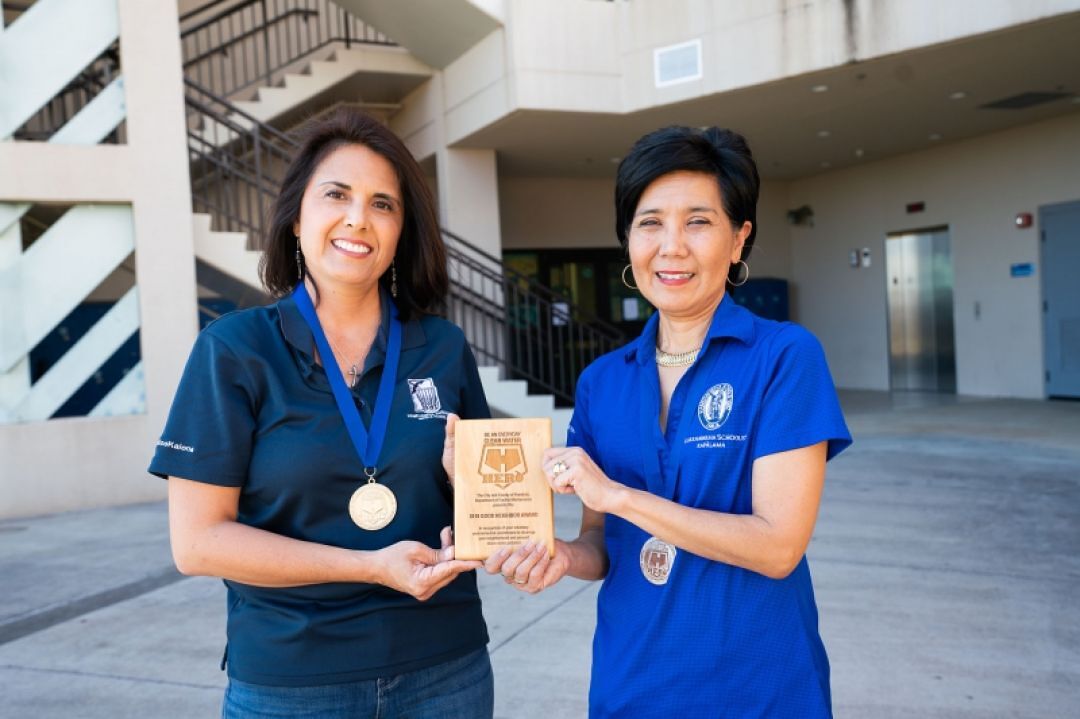 KSK Middle School Student Activities Coordinator Gail Vannatta (right) and Student Activities Assistant Lisa Akana were named Environmental Heroes and presented volunteer medallions by the City and County of Honolulu as part of its Storm Water Quality programs in February.
