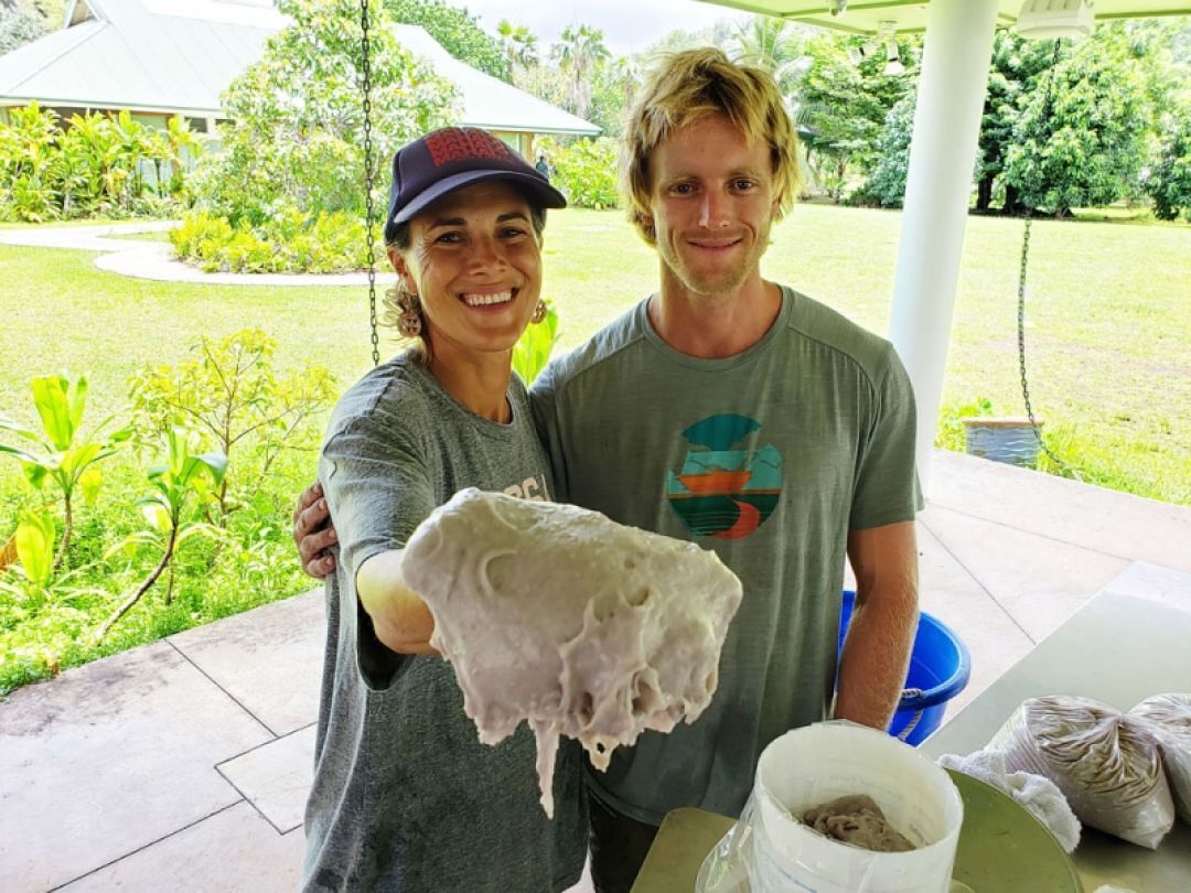 Mehana Vaughan, left, a volunteer at Waipā, and farmer Makana Martin showcase freshly made paʻi ‘ai as part of Poi Day, which is hosted every Thursday by the Waipā Foundation.