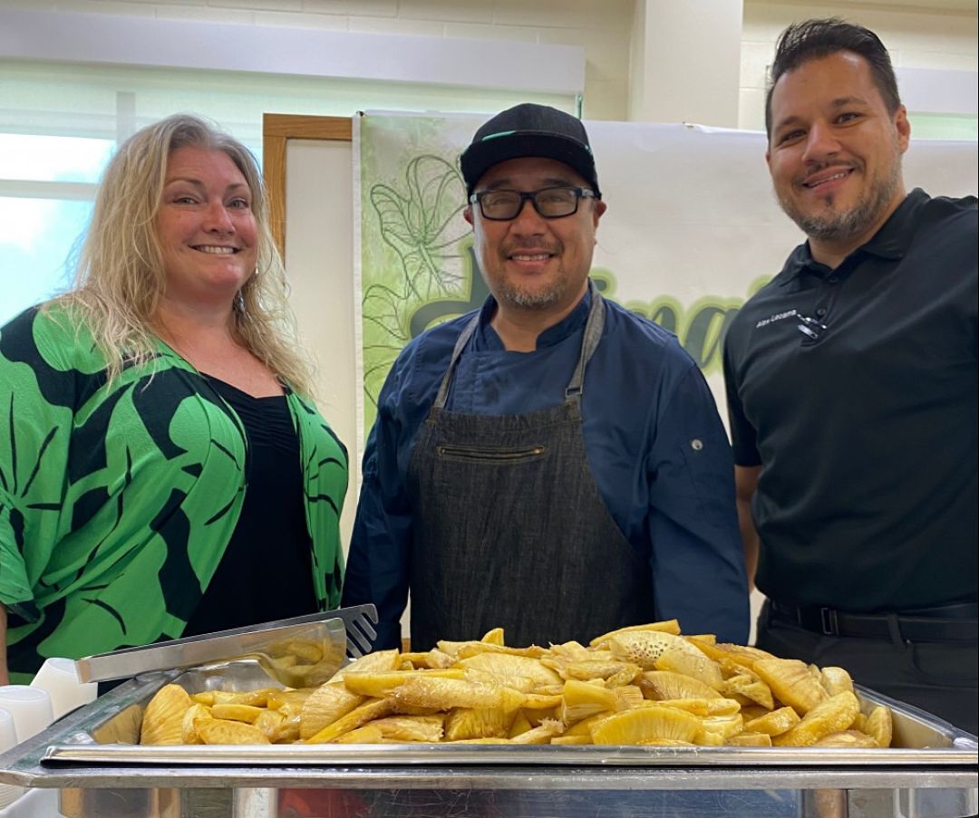Members of Flik Independent School Dining present Chef Kealoha Domingo and ‘ulu dish that kicked off the Hānai ‘Ai program at KSK.