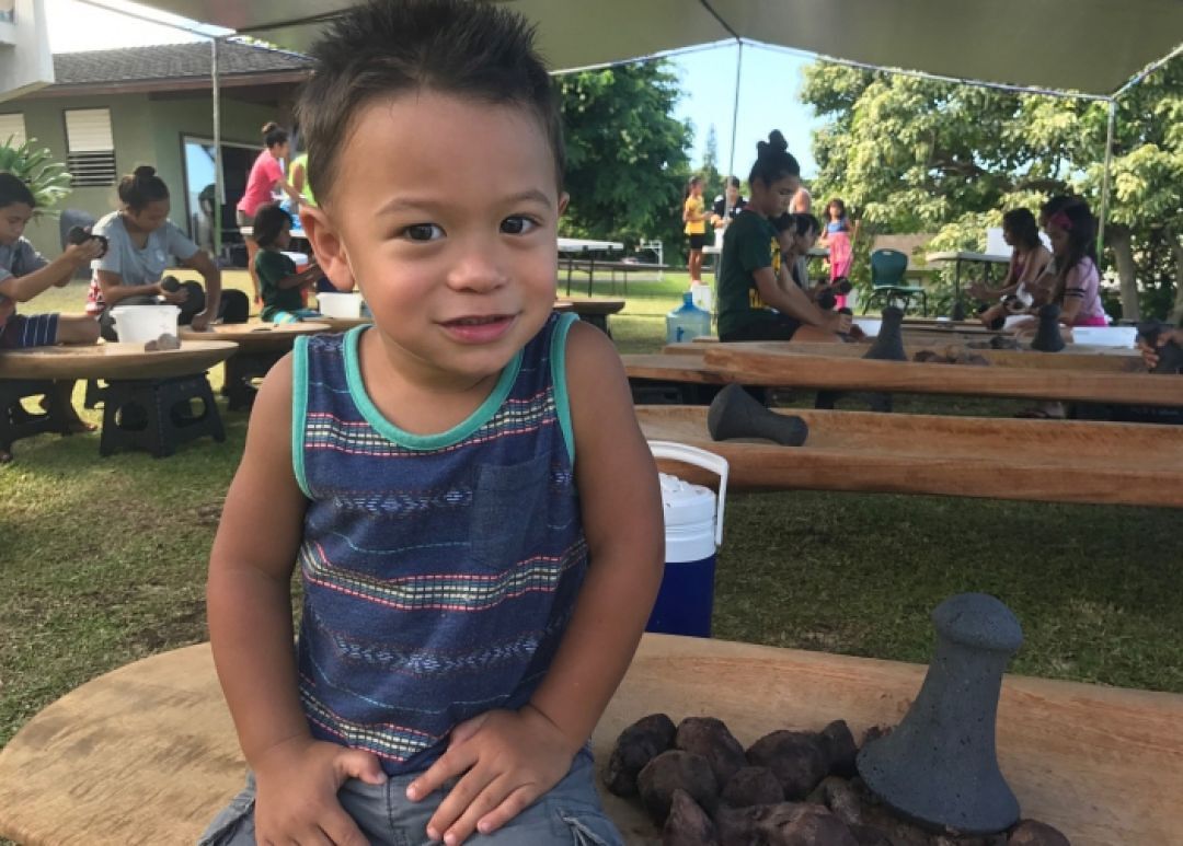 The precocious tot then wrapped his tiny fingers around a miniature-sized, bell-shaped pōhaku as he prepared to mash cooked kalo into poi. “Ku‘i,” his mother instructed him. The little boy then raised his pōhaku and began to pummel. Thump! Thump! Thump!