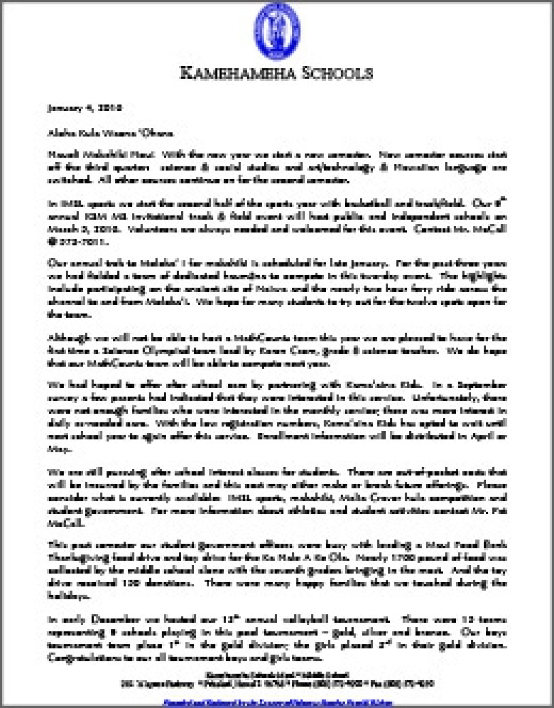 Aloha Parents. Please click here to view the End of Quarter 2 letter. We hope you had a fun and relaxing break and look forward to seeing all the students back on campus this Thursday, January 6th.