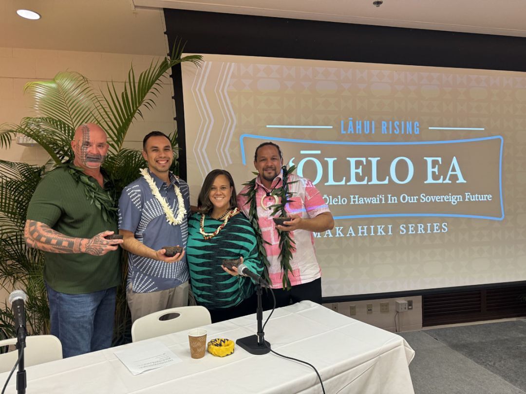 Ho‘okahua Cultural Vibrancy group recently hosted a panel discussion on the role of Hawaiian language in Hawaiian self-determination. The in-person event was held at Ka‘iwakīloumoku Hawaiian Cultural Center on the Kapālama campus. Dubbed “‘Ōlelo Ea,” this was the first in a series of four gatherings that will run once a month through the makahiki season, or November 2023 through February 2024.
