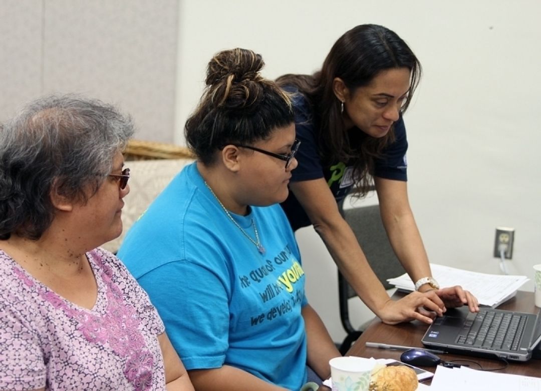 Resource center coordinator Kini Pihana helps the Chee ‘ohana with their applications. All three members of this ‘ohana will be in college this fall.