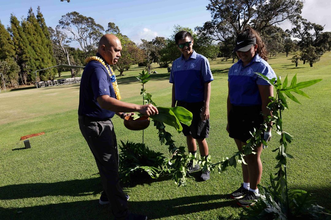 KS Hawai‘i Kahu Kaunaloa Boshard, left, and two members of the KS Hawai‘i Golf Team, Jayden Alonzo-Estrada and Adriana Lynn Volpe, take part in the blessing of the reopening of the Volcano Golf Course on March 31.