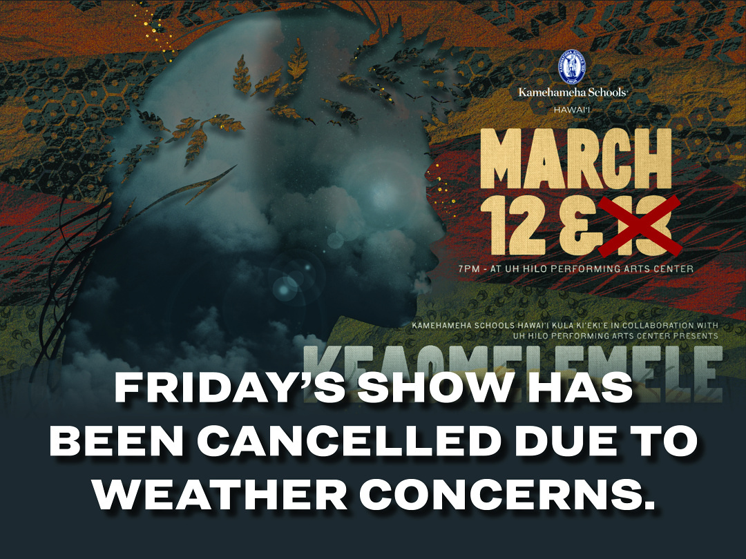 Out of precaution due to anticipated weather conditions due to the storm, we have made the unfortunate decision to cancel Friday night's performance of Keaomelemele. Refunds will be issued for all tickets purchased for Friday night's performance.