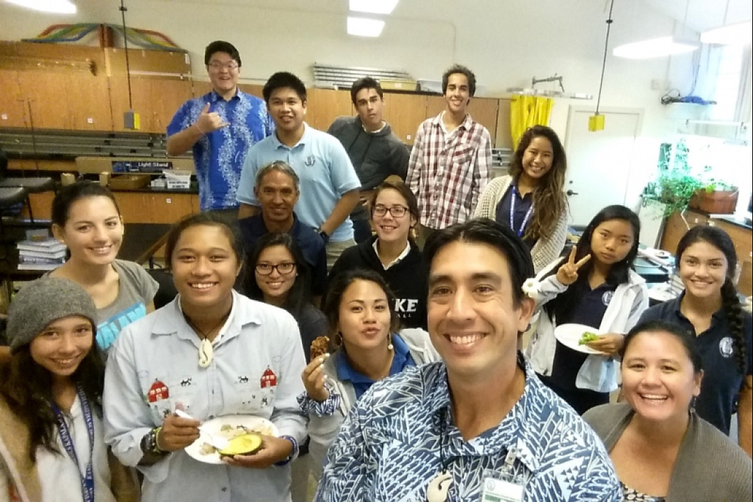 Polynesian Voyaging Society President Nainoa Thompson (back left) paid a visit to the Mālama Honua science class led by high school Science Department Head Chris Blake (front right). The master navigator told the students that the Mālama Honua Worldwide Voyage is about cultural empowerment and growing a more sustainable world.