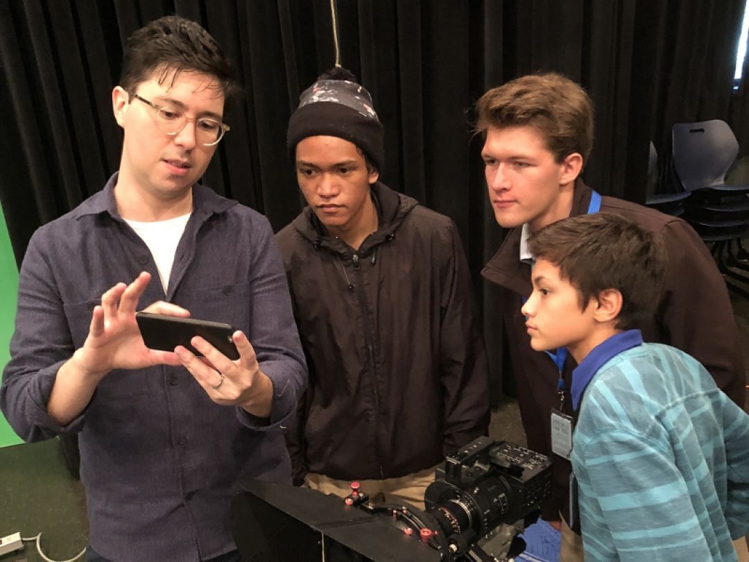 Spectrum’s Peio Pualoa, a KS alumnus, discusses shot angles with Kanaikoa Tolentino (c/o 2019), Jacob Edwards (c/o 2019) and Kuawela Aiona (c/o 2021).