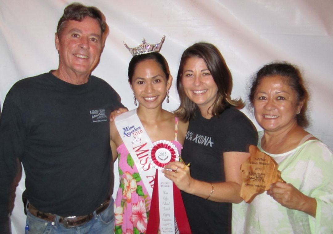 KS agricultural tenant Kona Coffee and Tea in Kailua-Kona garnered third place in the Kona Coffee Cultural Festival’s Cupping Competition. From l-r: company co-founder Dan Bolton, Miss Aloha Hawaiʻi 2016 Kristie Naʻone, Chief Operating Officer Malia Bolton, and co-founder Jan Bolton.