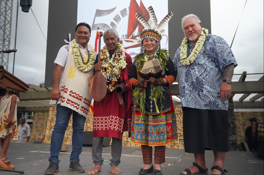 (Left to Right) Minister of Education and Culture of French Polynesia Ronny Teriipaia, Pwo Navigator Nainoa Thompson, Princess Zuljzulj of the Kaviyangan Paiwan, and French Polynesian President Moetai Brotherson posing for pictures after exchanging gifts.