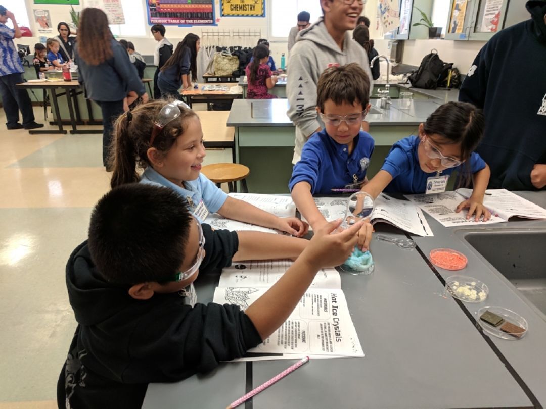 Second grade just attended the High School Chemistry Fair. The students reviewed the three states of matter. Thanks to the high school students they got to make milk plastic, explore various crystals, launch bottle boats, wrote in invisible ink and made and ate coconut whip cream!