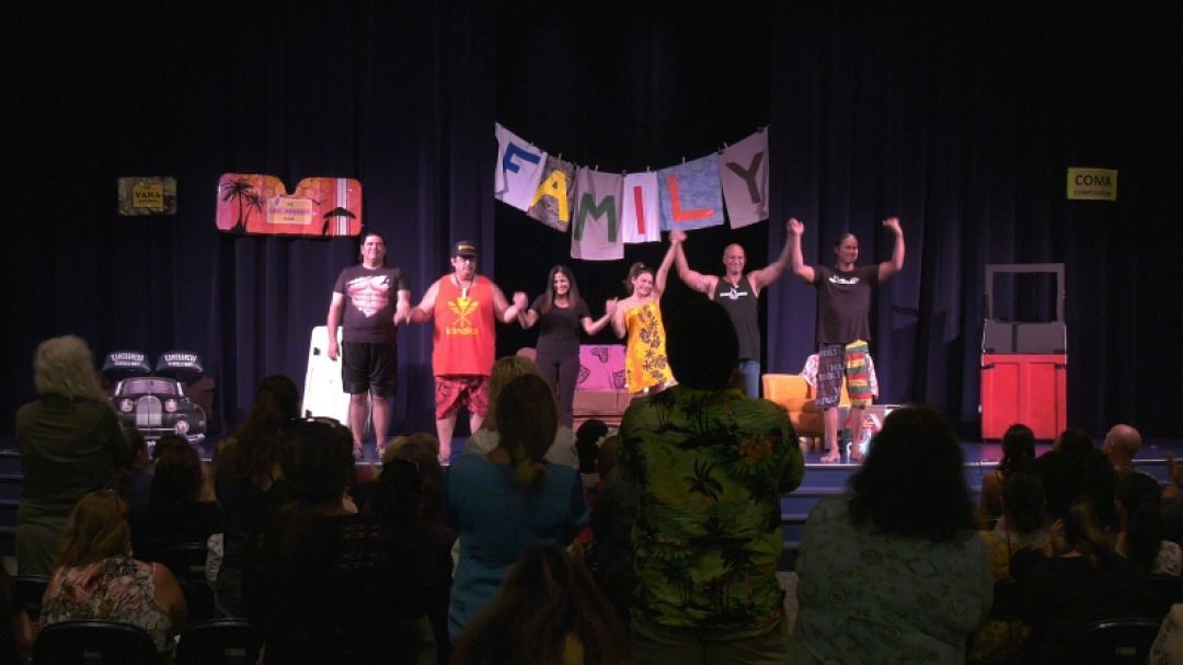 To kick off the Ho‘oikaika Conference, Venus Rosete-Medeiros, KS regional director for Maui, Moloka‘i and Lāna‘i (at center, in black), acted in the play “Family Laundry,” which was originally produced by KS in 1993. Rosete-Medeiros played the role of 11 characters during the performance, which presented the idea that sharing family problems is an act of courage when it comes to alcohol and drug abuse, as well as other domestic and mental health issues.